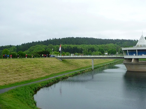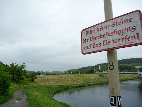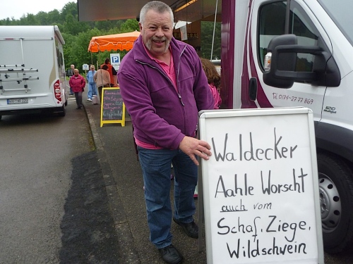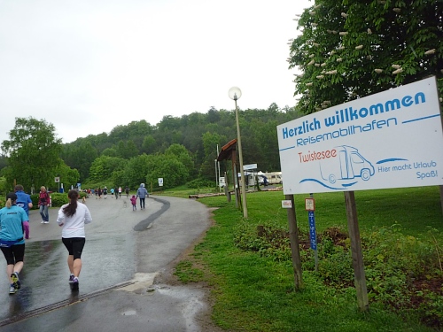 Es wird im Uhrzeigersinn um den Twistesee gelaufen, steil ansteigend beim Wohnmobilcampingplatz, wo später auch ein Metzger seinen Stand aufmacht und auch Hunde-und Katzenfutter…naja, ich hatte noch ein Brötchen mit “Augenwurst” dabei. Augenwurst ist zwar Teewurst, beinhaltet wohl aber alles außer Tee.