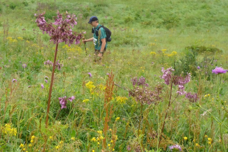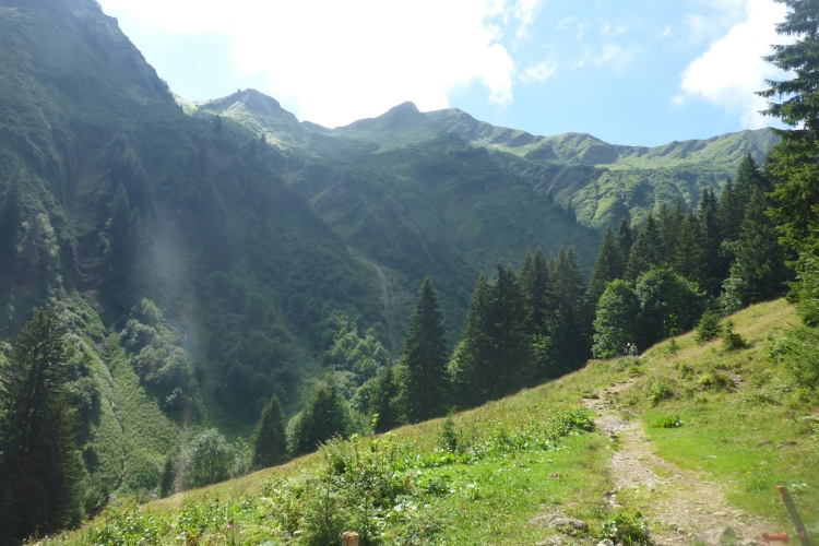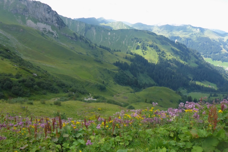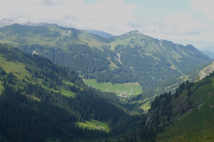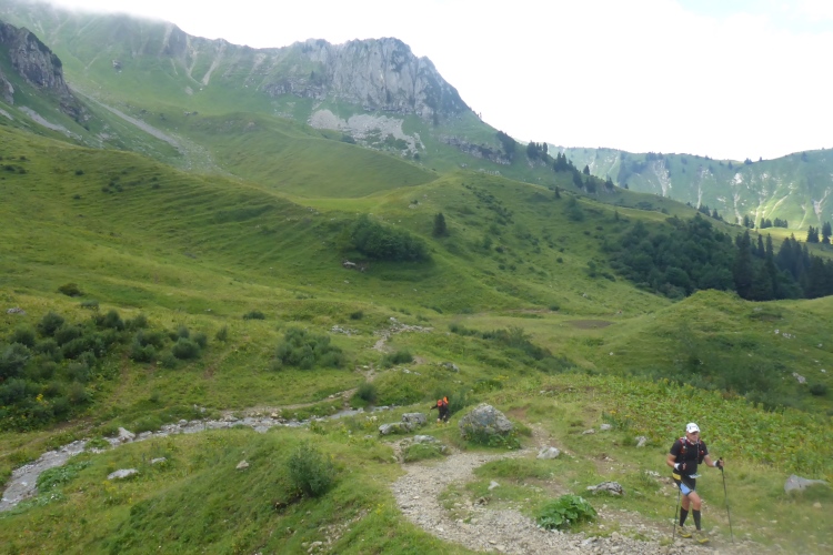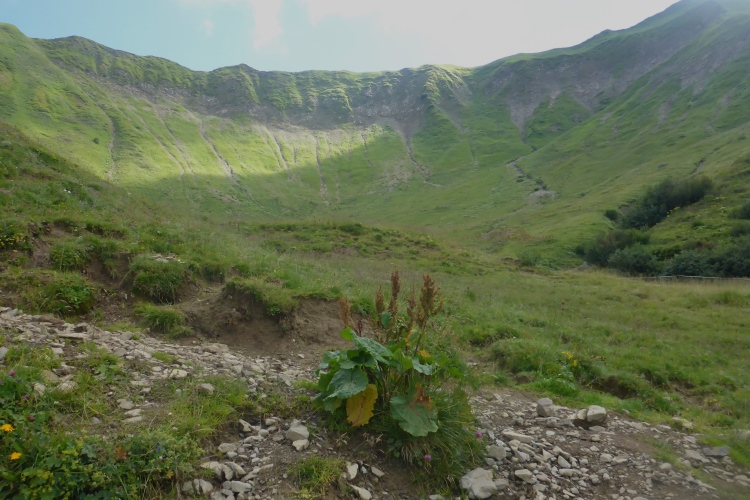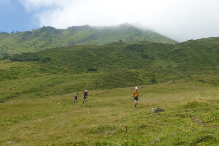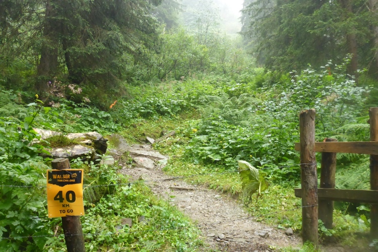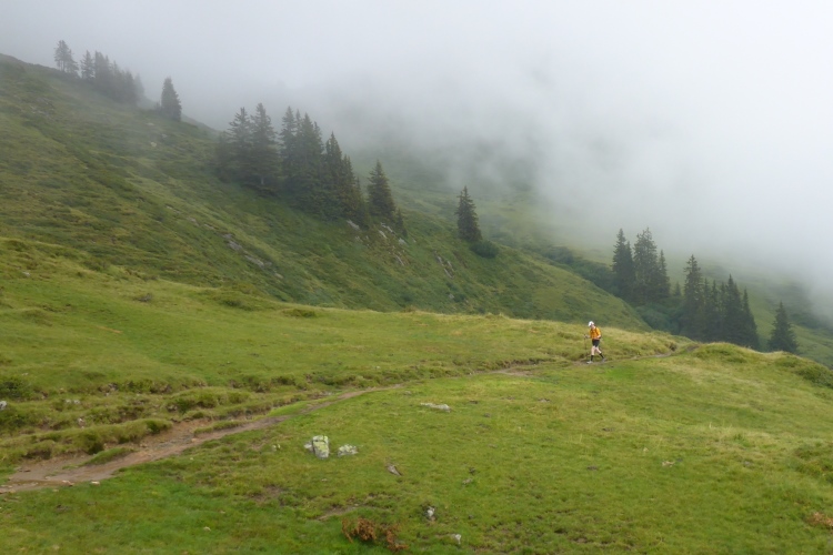 Bald darauf folgt ein besser laufbarer Trail. Endlich dringt die Sonne zu mir durch und ich sehe die Berge um mich herum. Ich weiß, dass ich mich nun sehr beeilen muss, denn die heute gültige Cut Off Zeit beträgt in Baad 15 Uhr. Zum Glück eignet sich der Abstieg von der Starzelalpe hinab nach Baad gut für einen sehr schnellen Abwärts-Sprint und ich bolze diese 500 Höhenmeter abwärts. Eigentlich bin ich der Überzeugung, seit der letzten Verpflegungsstelle nicht langsamer gelaufen zu sein als sonst, abgesehen von dem kurzen Abschnitt auf dem Grat. Daher irritiert es mich sehr, dass jetzt die Zeit knapp wird.
