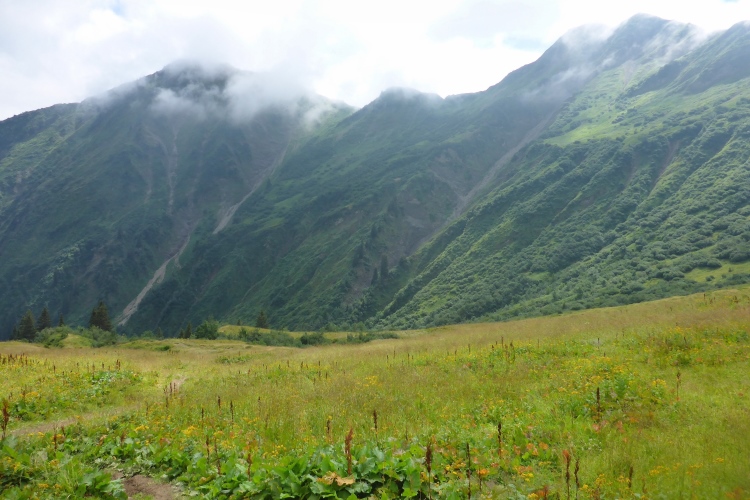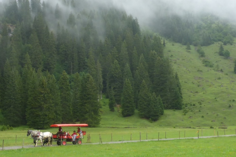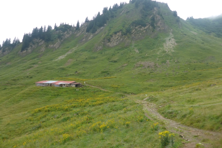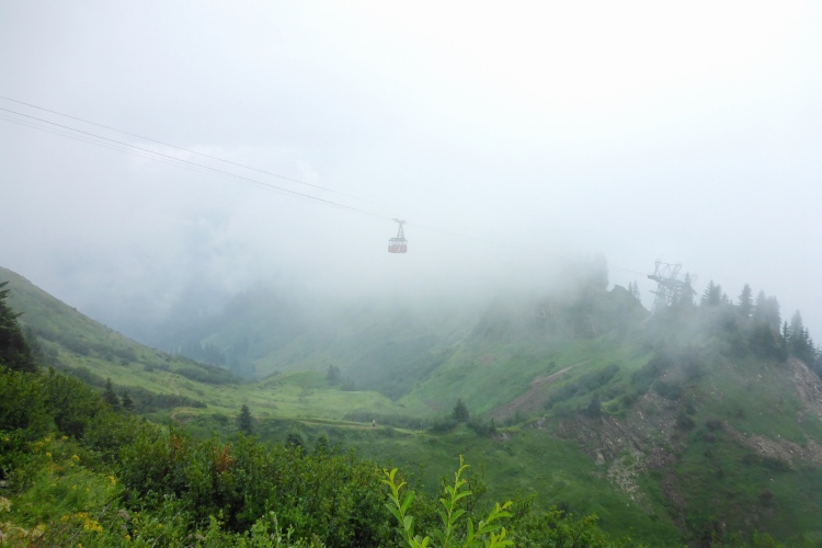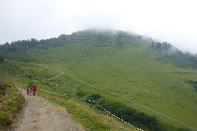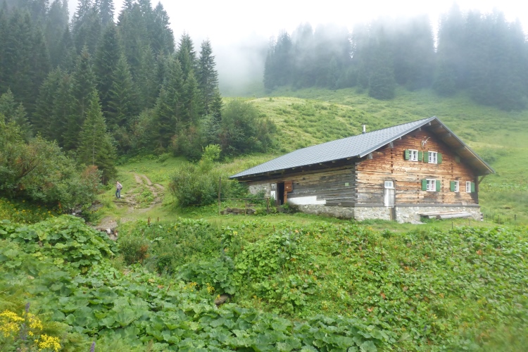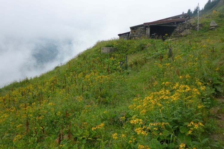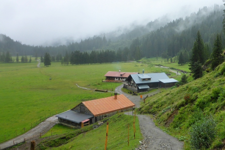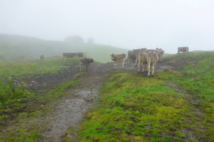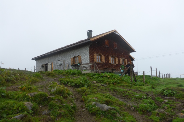 Wenig spektakulär geht es an der unteren und oberen Walmendinger Alpe vorbei bergauf. Der Wetterbericht hat sich geirrt. Noch immer sehe ich fast nur Nebel um mich herum! Auch die bei Sonnenschein herrliche Aussicht von Walmendinger Horn, wo wir auf ca. 1880 m knapp unterhalb der Gondelbahn Station ankommen, zeige ich Euch an Ende des Berichts.