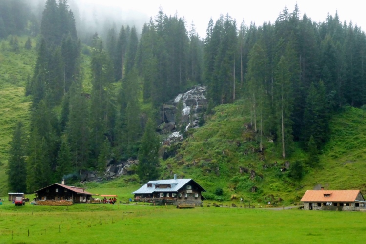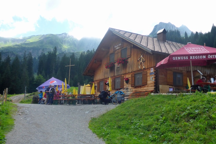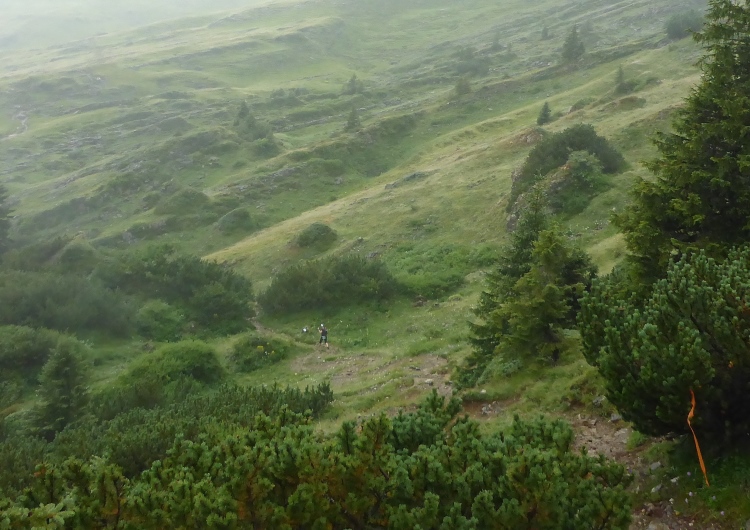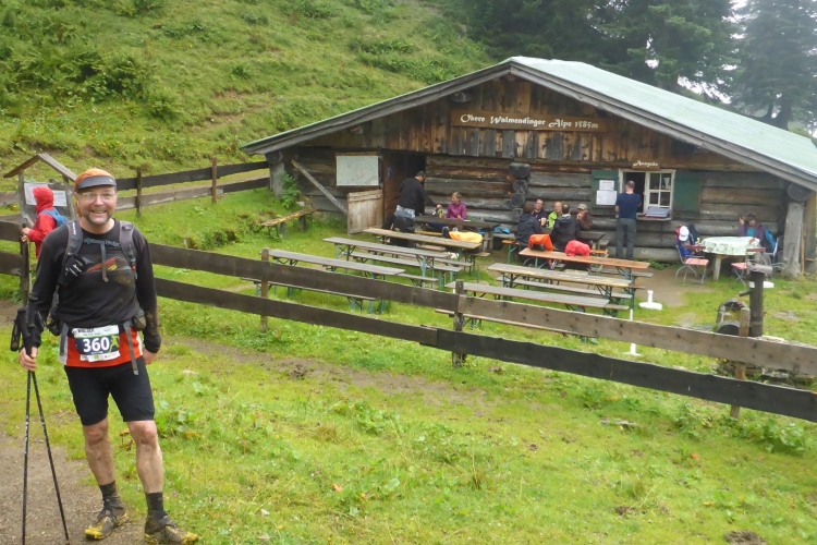 Der Film heißt weiterhin „Kühe im Nebel“. Kurze Zeit geht es noch auf und ab. Ab der Schwarzwasser Hütte (1620 m) kann man dann 3,5 km weit ordentlich Gas geben, was den bisher mageren Kilometerschnitt verbessert. Ab der Melköde (1346 m) laufe ich auf einem recht langweiligen, breiten Weg hinab, dann folgt ein kurzer Aufstieg zum Gasthaus Auenhütte (1273 m), wo die Verpflegungsstelle und die erste Cut Off Zeit ist. Zum Glück weiß ich, dass die im Roadbook angegebenen Zeiten heute nicht stimmen, ich also nicht zu spät bin.