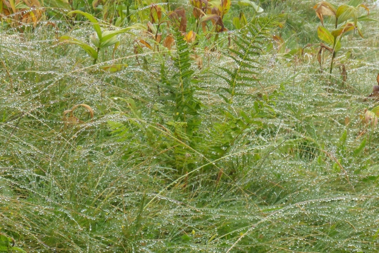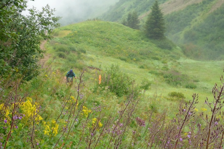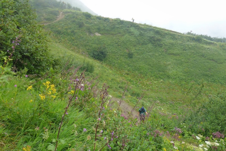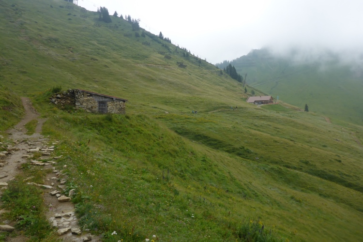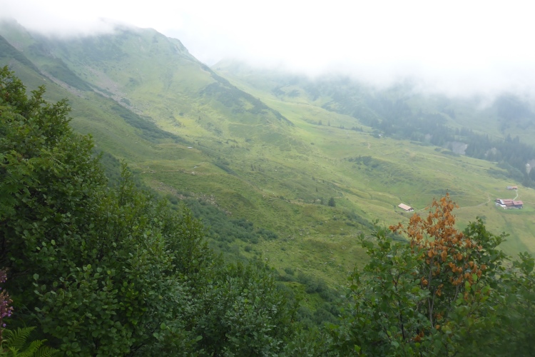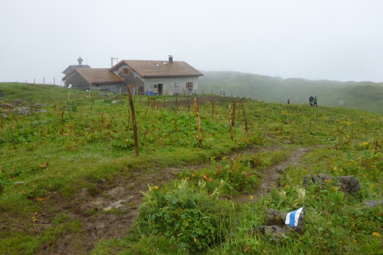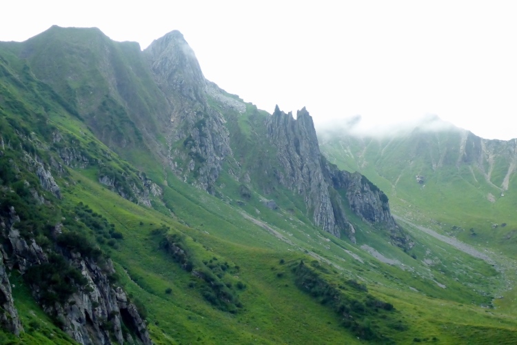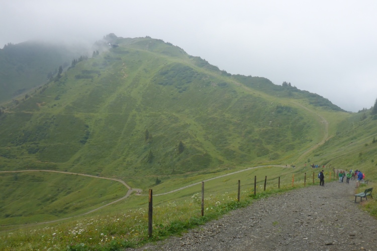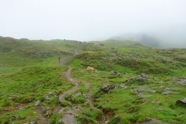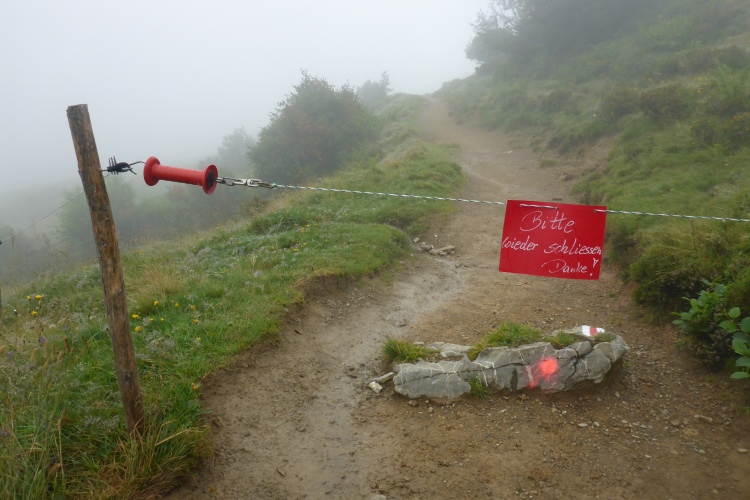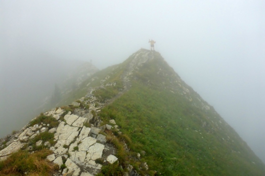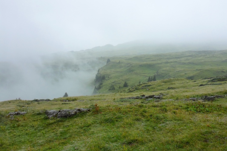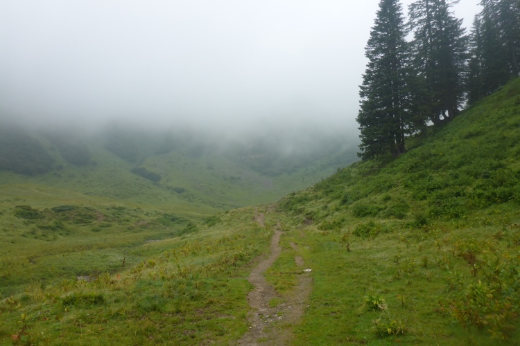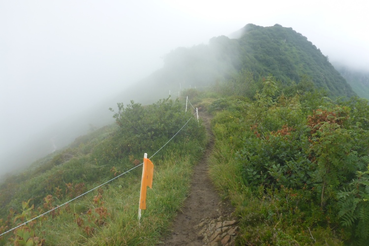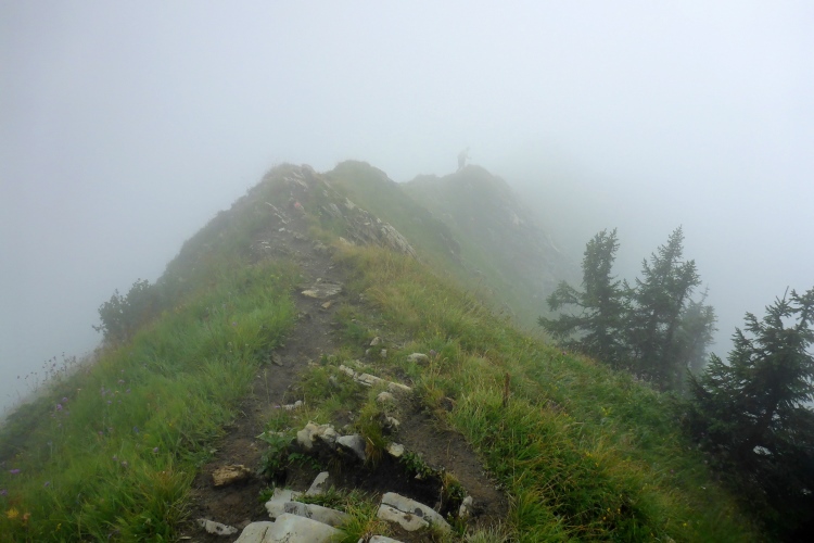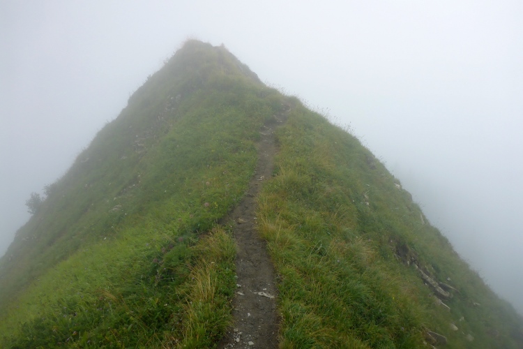 Ein paar hundert Meter laufe ich nun auf einem breiten, von vielen Spaziergängern genutzten Weg bergab. Zum Glück kann ich bald wieder auf einen einsamen Trail abbiegen. Nach insgesamt etwa 200 Hm Abstieg geht es erneut steil bergauf. Erst steige ich entlang einer Bergflanke, dann an einem Grat entlang. Ab und zu schimmert nun ein wenig Aussicht durch den Nebel, doch als ich auf 1995 knapp unterhalb des Grünhorn Gipfel links abbiege, sehe ich rings herum mal wieder nur Grau.