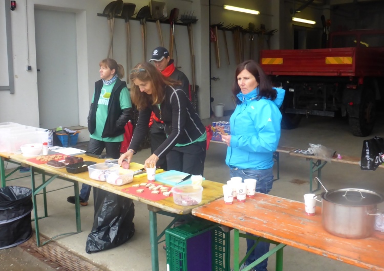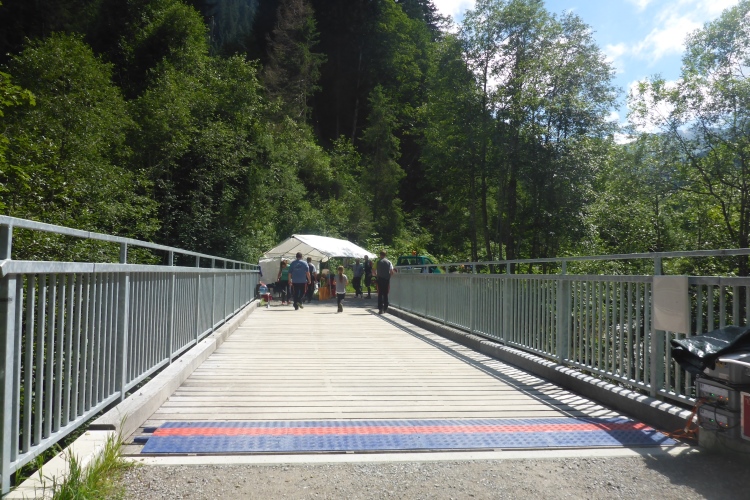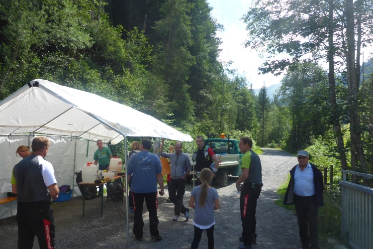 Jeder Blick auf die Uhr sagt: Schneller! Ich renne, den letzten, asphaltierten Abschnitt rase ich bergab, werde unten von Leuten nach rechts gewiesen, wo vor der Brücke über die Breitach die Zeitmessmatte liegt. 14:56 Uhr! Knapp, sehr knapp! Schade, die netten Leute hinter mir schaffen es wohl nicht mehr. Der Schlussläufer ist aber schon unterwegs und so halte ich mich nicht lange mit Essen auf.