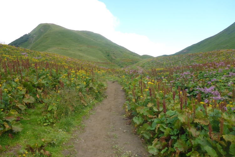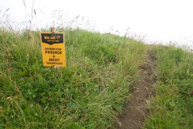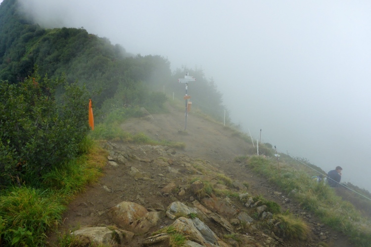 So steil wie es eben noch bergauf ging, laufe ich nun wieder hinab. Ein Schild warnt zu Recht vor einer Gefahrenstelle. Für die nächsten paar hundert Meter sollte man trittsicher und schwindelfrei sein. Ein schmaler, manchmal auch etwas rutschiger Pfad führt über einen sehr scharfen Grat. Direkt neben unseren Füßen geht es manchmal auf beiden Seiten sehr steil und weit in die Tiefe. Hier darf man nicht ausrutschen oder stolpern. Vielleicht ist es ganz gut, dass ich im Nebel nicht immer sehe, wie tief der Abgrund ist.