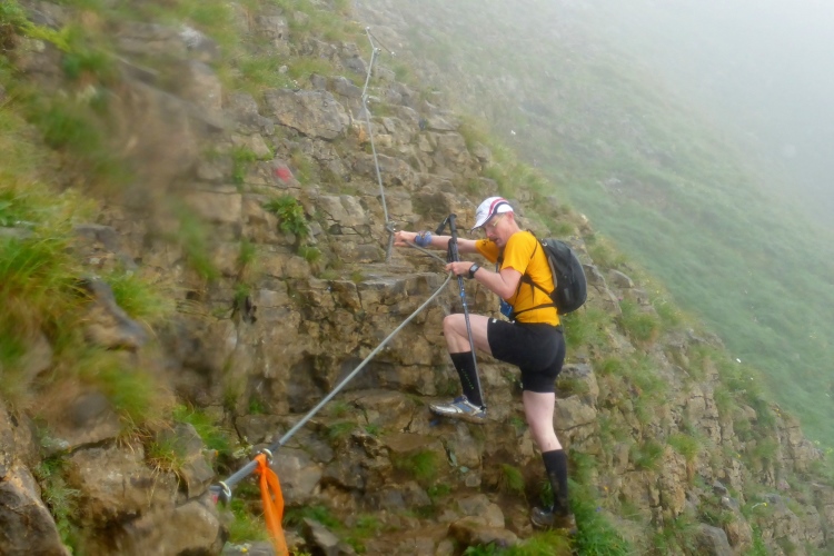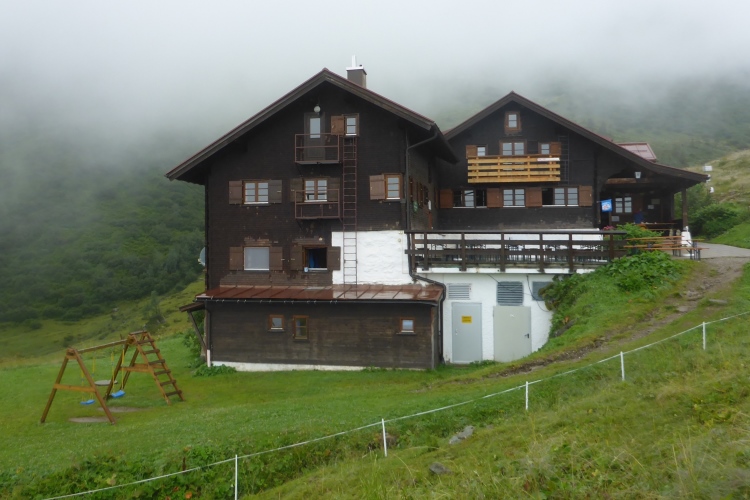 Die Strecke ist gut markiert, doch die schönsten Pfeile und Bänder können nicht verhindern, dass man sie in eine unaufmerksamen Moment einfach übersieht und in die falsche Richtung steigt. Das passiert mir sonst selten, doch hier merke ich nicht, dass unsere Route nun auf einen blau-weiß markierten alpinen Steig führt. Ich folge dagegen dem breiten, rot-weiß markierten Weg hinauf. Zum Glück weist mich Elke, der ich auf diesem Abschnitt immer wieder begegne, auf meinen Irrtum hin. Nur 200 m verloren. Anfangs steigen wir auf Geröll ein Kar hinauf. Dann folgen einige mit Drahtseilen gesicherte, etwas ausgesetztere Stellen, die ich aber als leichter empfinde, als vorhin den rutschigen Kalk. Knapp unterhalb des Gipfel des Hohen Ifen führt unser Trail dann wieder steil hinab. Noch immer zeigt der Panoramablick nur grau, grau und wieder grau.