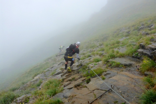 Jetzt wird es rutschig. Richtig rutschig! Die perfekte Droge für einen bekennenden Schlamm-Fan wie mich. Keine Ahnung, wie schnell die guten Läufer hier hinab rasen, als normalee Läufer muss man hier auf jeden Fall gut aufpassen. Aber welch ein Spaß! Garniert wird dieses Abenteuer durch weitere Klettereien am Seil, dieses Mal abwärts. Ich höre den Einwand mancher Leser, was dies noch mit Laufen zu tun hat. Aber eigentlich ist es nicht besonders schlimm und die gut laufbaren Abschnitte dominieren heute.