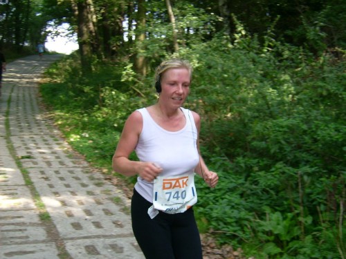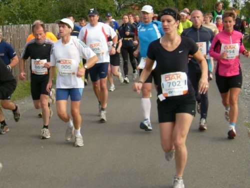 Bei einem Beton-Kolonnenweg, einer so wie früher am Eisernen Vorhang, überhole ich Katja Burkhardt aus Bucha. Für sie reicht heute der „Halbe“. Da sie einen Knopf im Ohr hat, wahrscheinlich hört sie „Highway To Hell“, muss ich mehrmals nachfragen, wie es ihr geht.