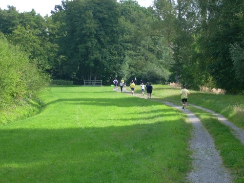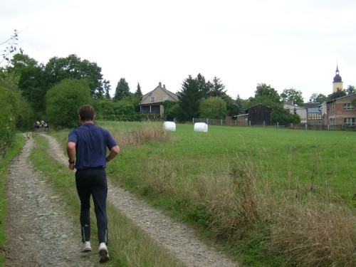Wir laufen ein kleines Stück Asphaltstraße und dann geht es schon ins Gelände mit ruppigem, grasigem Untergrund. Hinterhalb des Sportgeländes des TV Weißendorf laufen wir dann in die Gemeinde Weißendorf hinein. Wenn man bedenkt, dass der Ort lediglich 350 Einwohner hat und die Veranstaltung an die 100 Helfer braucht, dann hat der Danny bereits im Vorfeld schon fast die halbe Dorfbevölkerung verpflichten müssen.