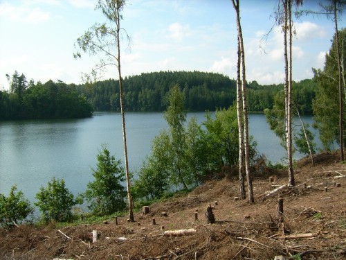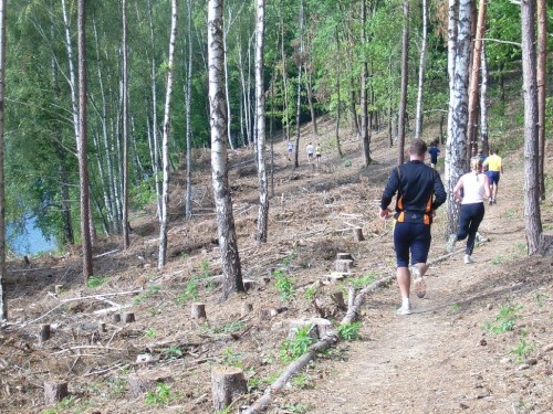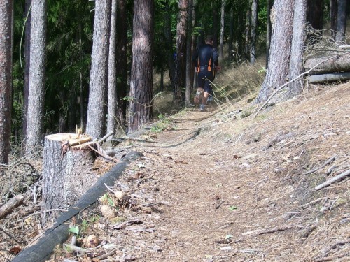 Hinter den Leitplanken einer schmalen Straße geht es hart aufwärts. Für einige heißt es wieder Gehen. Es geht wieder kurz hinunter zum See. Dann nach dem Überlaufen einer längeren Holzbrücke geht es rechts hinauf. Die Stelle, wo man mit der Holzabfuhr nicht fertig wurde. Es geht so steil bergauf, man hat die Laufstrecke direkt an den Hang gelegt. Allradantrieb wäre nützlich. Auf allen Vieren hochkrabbeln ginge auch.