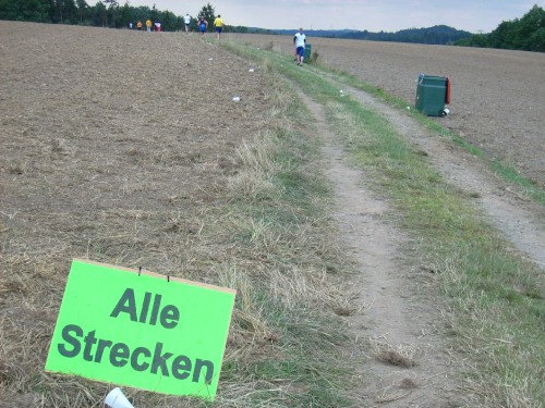 Dann ist die erste Runde fast geschafft. Ich biege auf die Asphaltstraße vor dem Startgelände ein, laufe 200 Meter entlang und biege dann auf dem Sportgelände in die eigene Durchlaufspur. Und bin dann fast alleine!