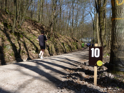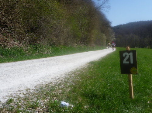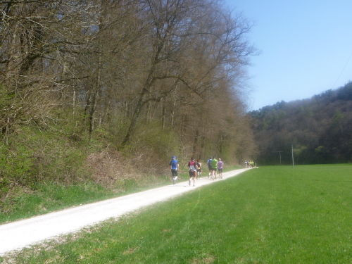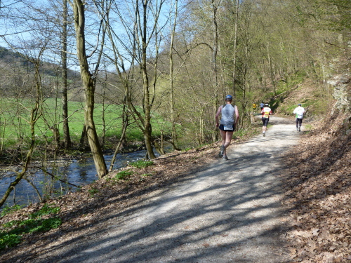 Nach dem leichten Anstieg zuletzt laufen wir jetzt wieder abwärts, um dann unmittelbar dem Flusslauf zu folgen. Die negative Höhendifferenz von 140 Metern bis hierher ermöglicht mir trotz der Anstiege eine ganz „normale“ Zwischenzeit, ohne dass ich es darauf anlege. Ich genieße den strahlenden Sonnenschein bei genialer Temperatur in herrlicher Landschaft und angenehmer Gesellschaft.