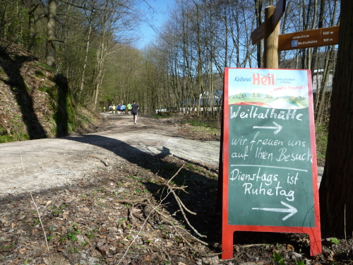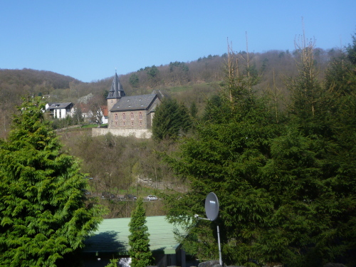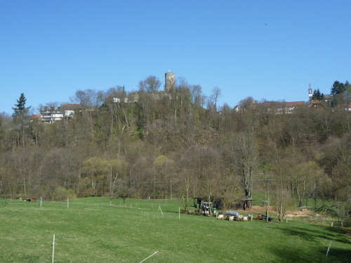 Weiter geht’s. Nach einem kurzen Stück durch den Wald sind wir wieder auf der fast durchgängig parallel zum Weiltalweg verlaufenden Verkehrsstraße und kommen nach Alt- und Neuweilnau (km 11) mit der Burgruine aus dem 13. Jahrhundert. Die Burg wurde im 30jährigen Krieg zerstört und die Steine als Baumaterial verwendet. Einigermaßen gut erhalten ist nur noch der runde Bergfried.