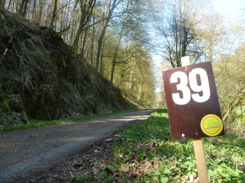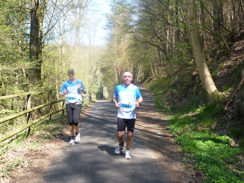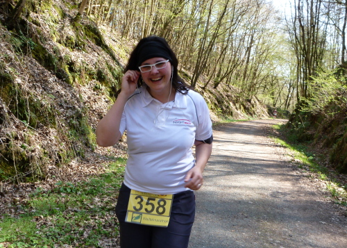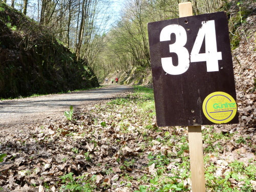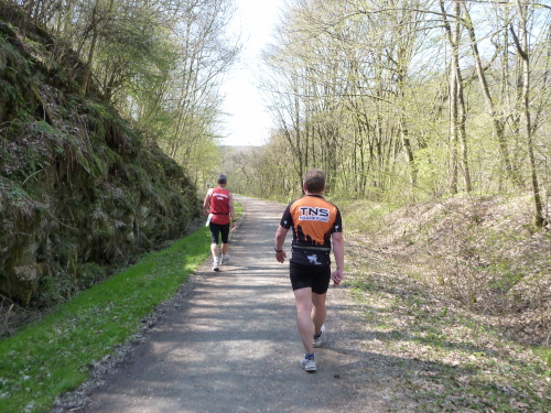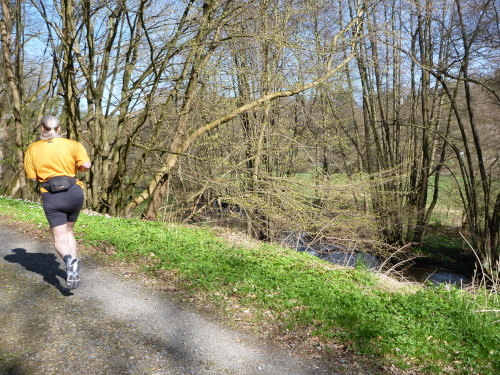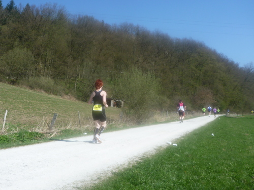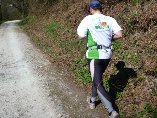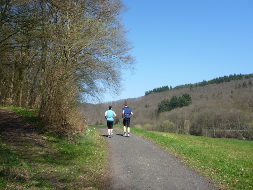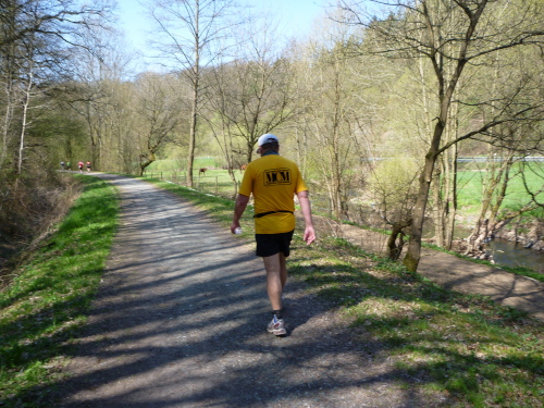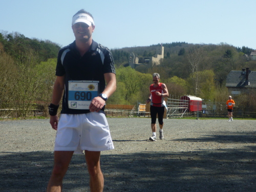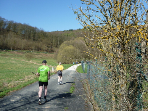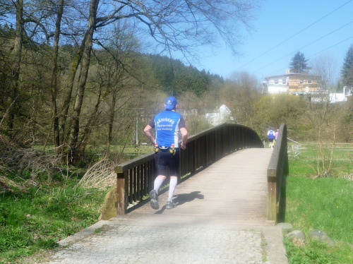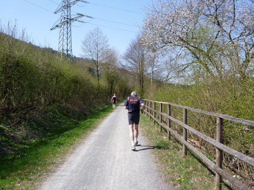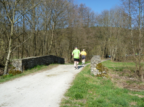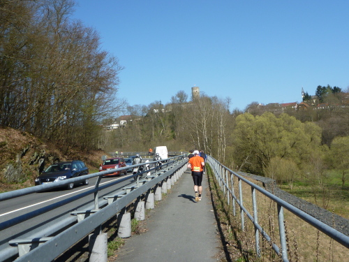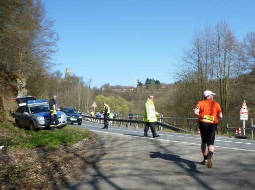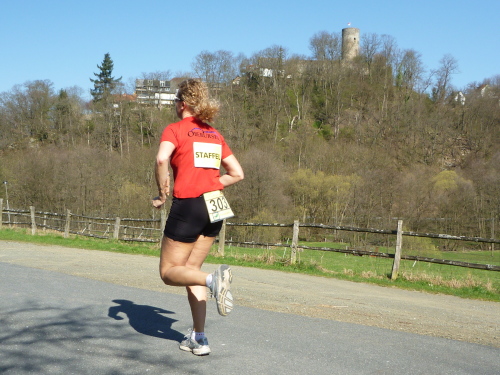 In Ernsthausen (km 33) ist für die Staffelläufer der letzte Wechsel. Den Schlussläufern ist der bequemste Streckenabschnitt vorbehalten, denn nennenswerte Steigungen gibt es jetzt keine mehr. Die Strecke folgt auf einem alten Bahndamm immer dem Flusslauf, genau wie auf der anderen Seite die Verkehrsstraße. Kaum nehmen die optischen Reize etwas ab, nehme ich die Signale des Körpers, in erster Linie die meiner Beine, deutlicher wahr. Es reicht, meinen die. Aber 4 Kilometer sind noch zu laufen und es wird noch einmal spannend. Ich entdecke eine alte Burgruine und erkundige mich danach.