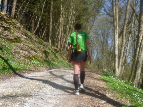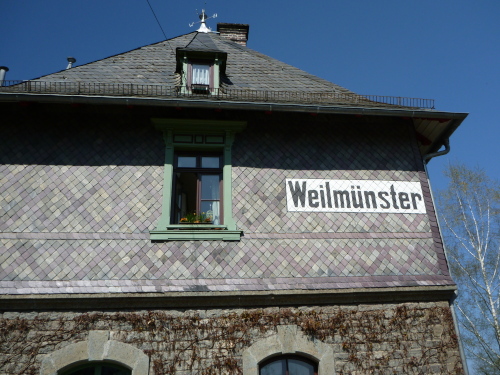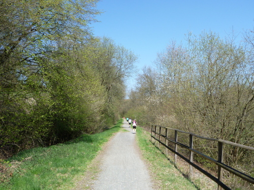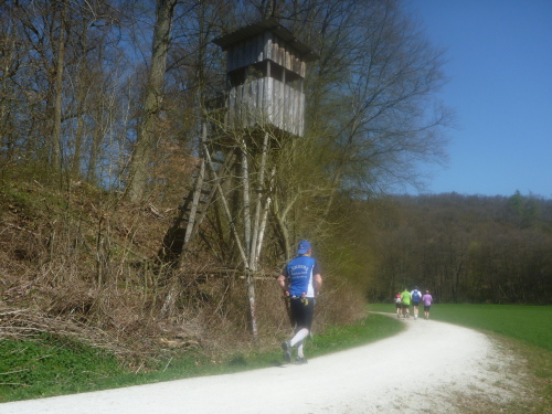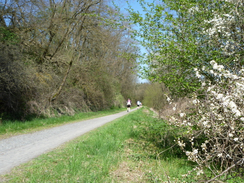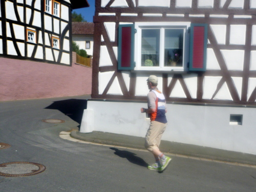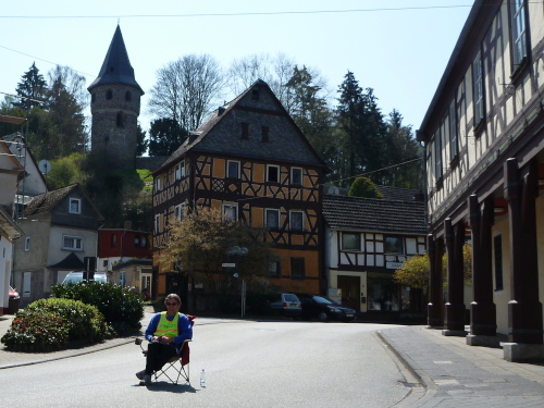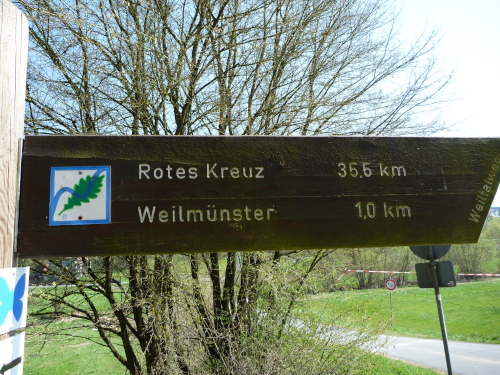 Das erste, was wir von Weilmünster, mit rund 9000 Einwohnern der größte Ort an der Strecke, sehen, ist das Klinikum (km 28), in dem fast 700 Menschen beschäftigt sind. Im Städtchen selbst sitzen die Leute im Straßencafé, genießen Espresso und Eis und können sich nicht vorstellen, dass es an einem Tag wie diesem Schöneres gibt. Es gibt. Neidlos laufe ich weiter, bestaune das Alte Nassauischen Amtshaus, die Kirche mit dem Wehrturm und die schönen Fachwerkhäuser. Ich erfreue mich an blühenden Schlehensträuchern und meine, dass jetzt die Bäume noch einmal grüner sind, als kurz zuvor.