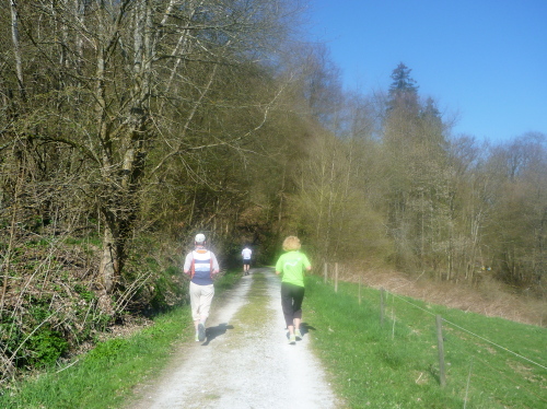 Das Tal ist auf den nächsten Kilometern sehr breit, der Fluss schlängelt sich durch grüne Wiesen und ich denke gerade, dass es wohl der bisher längste Streckenabschnitt sein wird, der fast eben verläuft. Schon ist Schluss damit, denn der Weg am Waldrand steigt jetzt deutlich und ziemlich lange an. Ich sehe schon seit geraumer Zeit eine Gruppe Läufer vor mir, die ich jetzt hoffe, einholen zu können. Nichts da, auch sie ziehen voll durch, machen keine Gehpause. Nach 600 Metern geht es wieder abwärts. Locker laufen und entspannen ist angesagt. Unerwartet gibt es moralische Unterstützung von vier weiblichen Fans. „Das hatten wir auch noch nicht“, meint eine, als ich die Gruppe ablichte. Dann wurde es aber Zeit.