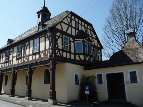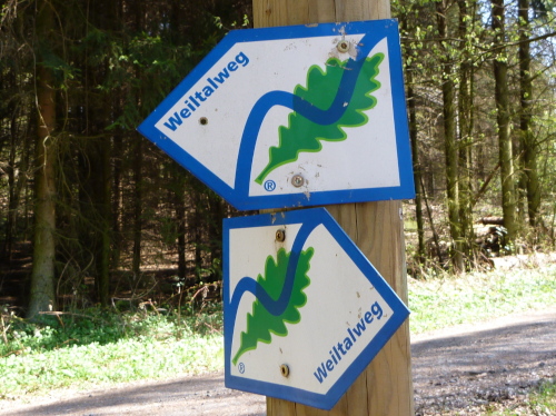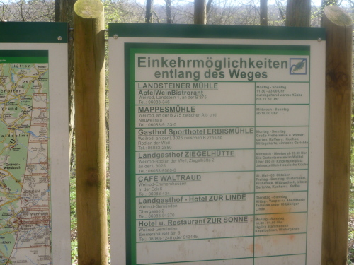 Das unscheinbare Örtchen Rod an der Weil (ca. km 16) wird als nächstes erreicht. Leider laufen wir nicht durch den Ort, sondern machen eine Schleife drum herum. Dadurch wird uns eines der ältesten Pfarrhäuser (13. Jahrhundert) Deutschlands vorenthalten. Nur die Kirche sehen wir, weil sie nicht wie üblich mitten ins Dorf, sondern auf eine Anhöhe außerhalb gebaut ist und ein paar alte Fachwerkhäuser, als wir den Ortsrand noch einmal streifen, um dann wieder im Wald zu verschwinden.