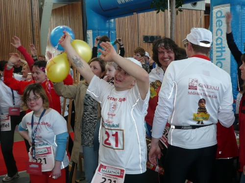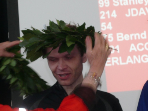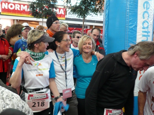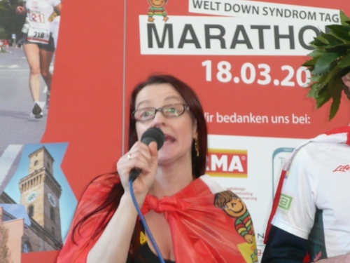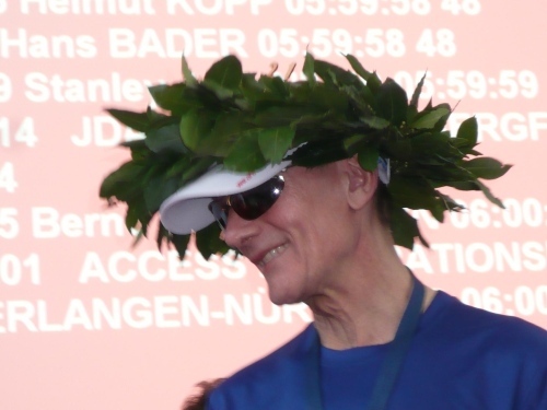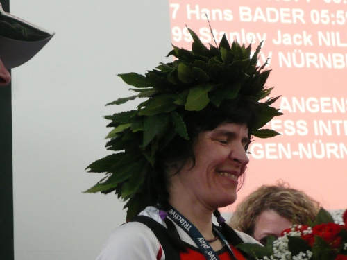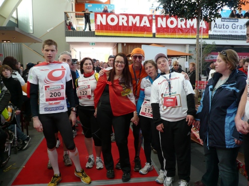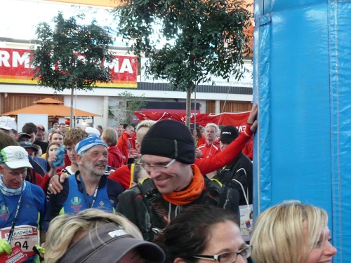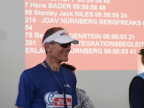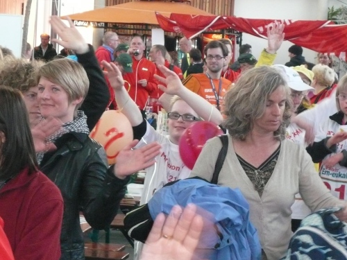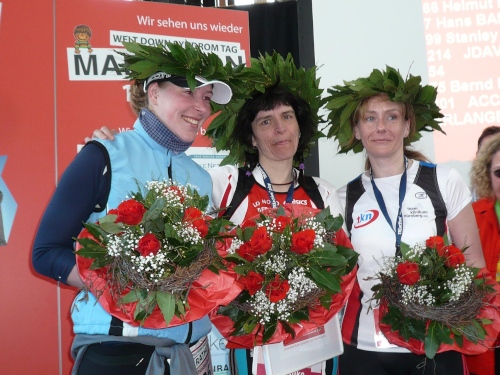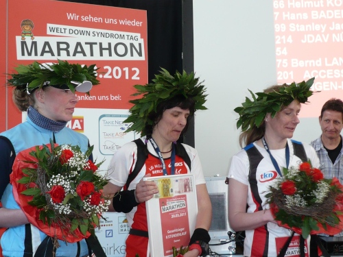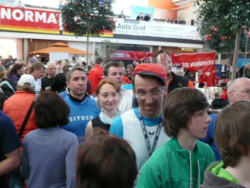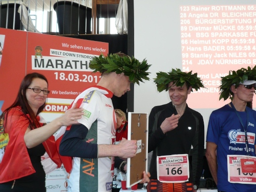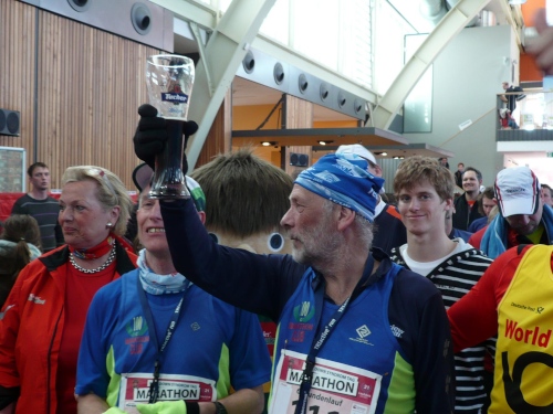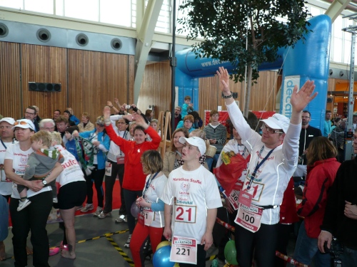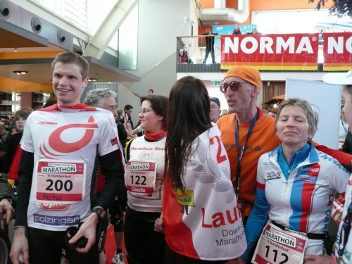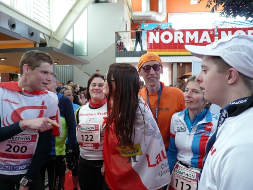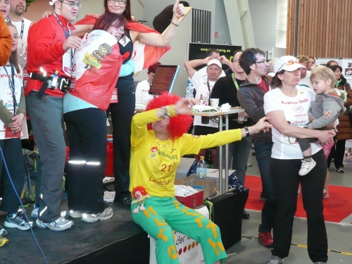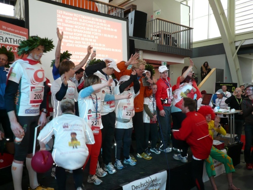 Dann laufen wir unter Nennung aller Finisher noch mal in die Halle ein und werden gefeiert. Wir erhalten unser Finishergeschenk. Ich erlebe die bisher schnellste Siegerehrung, denn in Minutenschnelle werden die schnellsten Frauen, Männer und Staffeln geehrt.