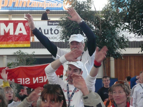 Ein paar Fans haben sich positioniert und geben und die Restlaufzeit auf einem Plakat an: Noch 60 Minuten, noch 45, noch 30. Dann folgen 5-Minuten Abschnitte. Dann glaube ich an einer Halluzination zu leiden. Eine kaffeebraune Schönheit von hinten, nur verhüllt durch einen weissen Tanga mit Aufschrift „Ziel – Bravo“. Aaah, ein Plakat. Schnell fotografiert. Mein englischer Freund Les hat mittlerweile seinen Geschmack im Bavarian White Beer gefunden. So marschiert er mit einem halbvollen Bierglas dem Finish entgegen.