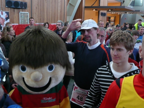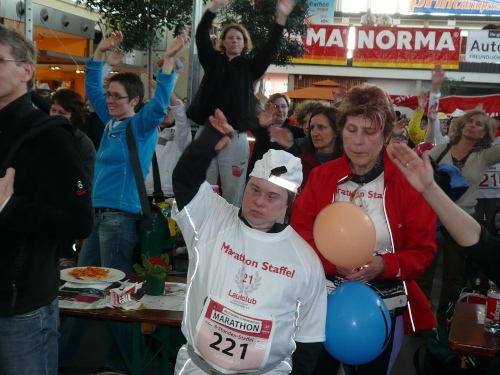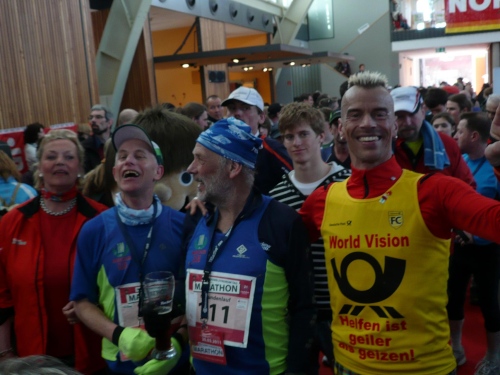 Dann sehe ich Pumuckl und seinen Clownbruder Rolf Kessler an der V-Stelle stehen. Ich greife mir einen Becher Cola. „Hast Du Bock auf Bock?“ fragt Pumuckl scheinheilig um meinen Bierdurst wissend und schenkt dann den Becher randvoll ein. Ich sehe mich schon in Schlangenlinien weiterrennen, will mir aber nicht die Blöße geben und leere den Becher. „Hat nur 7,2 Umdrehungen.“ Ja, der Bajuvator Doppelbock schmeckt in der Fastenzeit besonders. Die Klosterbrüder haben schon gewusst, wie man die harte Zeit überbrücken kann.