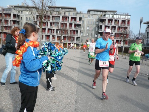 Wer so einen Rundenlauf noch nicht bestritten hat, dem lege ich das nahe. Ihr werden sehen, es ist äußerst kurzweilig und abwechslungsreich. So hat mir Klaus den Lauf im letzten Jahr schmackhaft gemacht. Beginnend mit den Kindern der Burgfarrnbach Shamrocks, die uns mit rhythmischen Rufen weiter treiben. Später sehe ich sie mit akrobatischen Kunststücken. Herrlich!