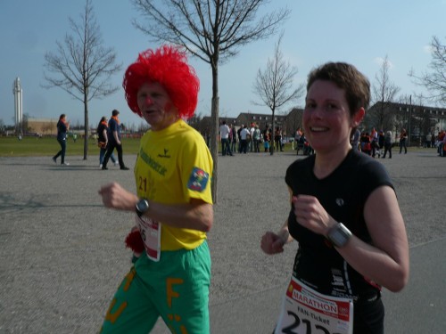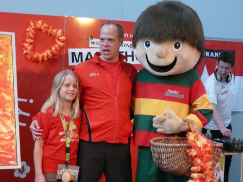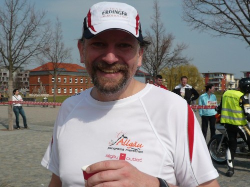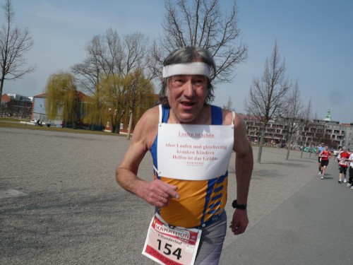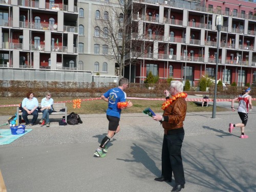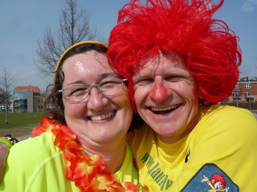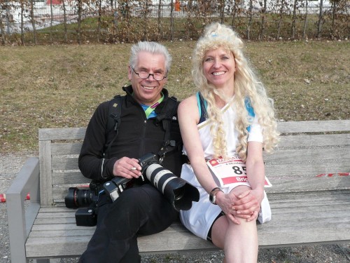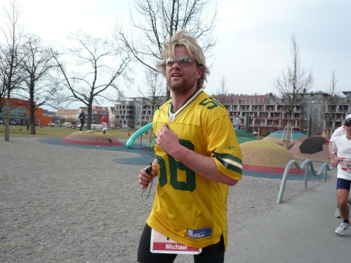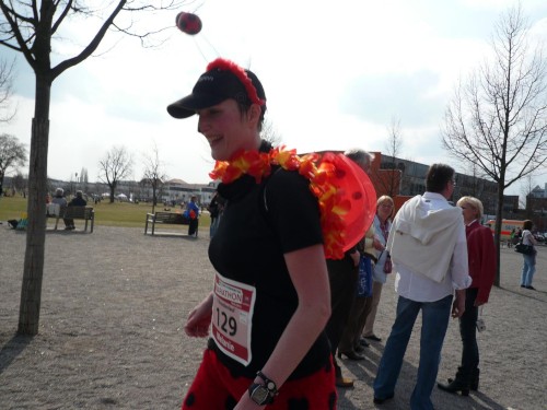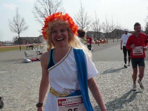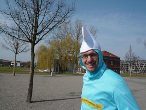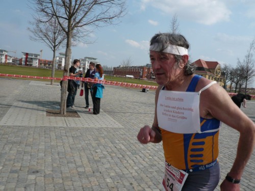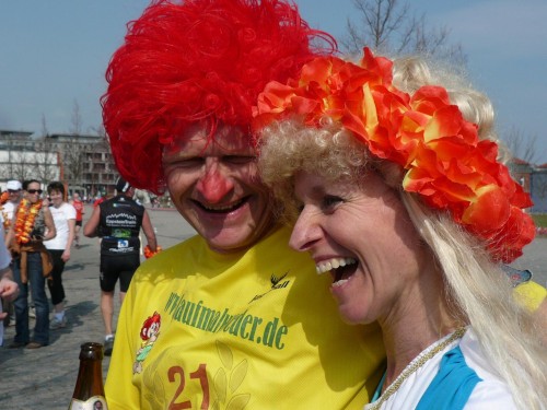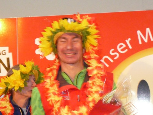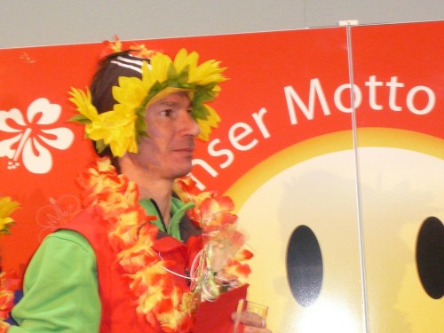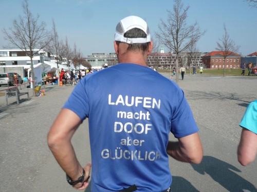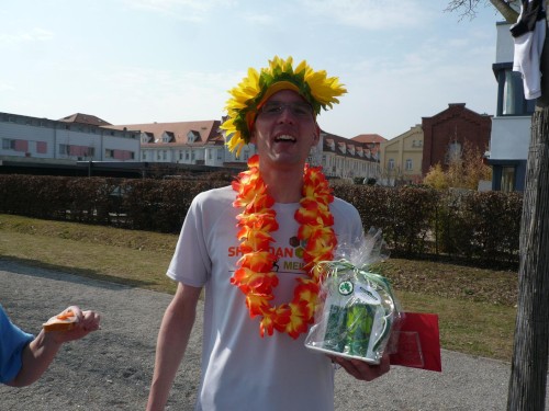 „Macht Laufen doof“, lese ich auf einem Shirt. Der Träger gibt mir gleich die Antwort, denn die Rennerei macht glücklich. Pumuckl sagt, die Lauferei is guat, wenn net die Rennerei wär. Ja, wenn man sich im Lauffeld umschaut, fällt auf, dass sich viele verkleidet haben. Ihr seht es an den Bildern. Später sehe ich Roland mit einem Siegeskranz im Haar. Er konnte sich noch auf den Gesamtplatz zwei vorarbeiten und hatte lediglich ein halbe Minute Rückstand zum Sieger.