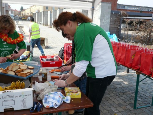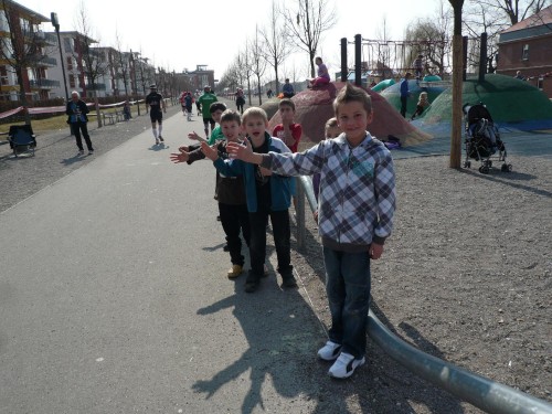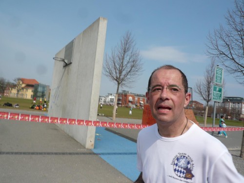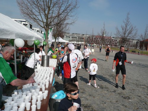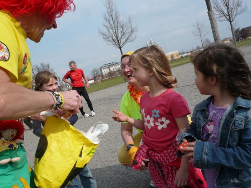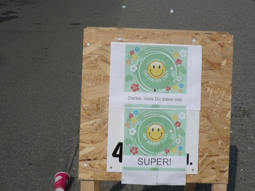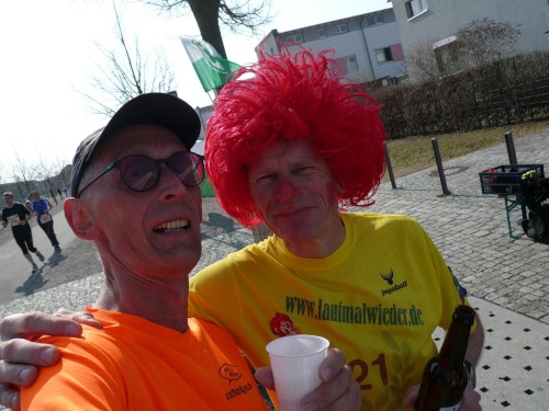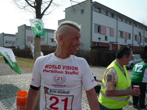 Pumuckl hat seine Versorgungsstelle auf die andere Laufseite verlegt, wo er mit einem Helfer ratscht. Ich muss weiter, mein Ziel! Später sehe ich ihn mit einer Handvoll Kinder, die eine Überraschung aus seiner Tüte bekommen.