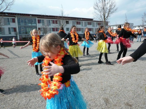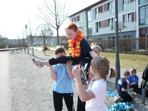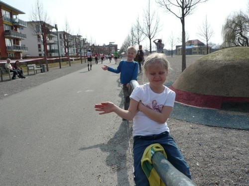 Mittlerweile ist die Temperatur gehörig gestiegen. Ich entsorge das langärmelige Shirt, bevor ich wie ein Bock schwitze. Mittlerweile stehen viel mehr Zuschauer am Rand der Strecke. In der Mitte der Grünfläche wird gekickt und auch der Spielplatz ist gut besucht. Immer wieder stehen Kinder am Rand und wollen abgeklatscht werden. Junge Läuferinnen und Läufer der Schule Schloss Neubeuern haben sich es jetzt auf Liegestühlen bequem gemacht und lachen, als ich einen dummen Spruch loslasse. Zwischen 30 und 40 Kilometern werden sie hinter sich bringen, das ist doch eine super Leistung für die Teens.