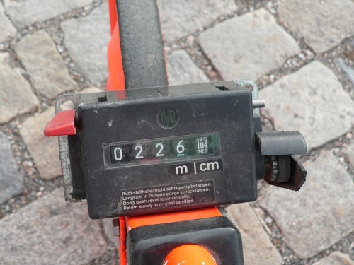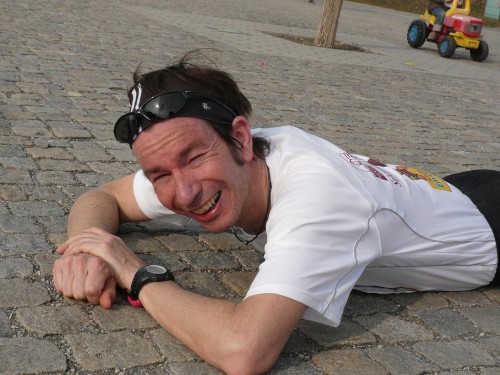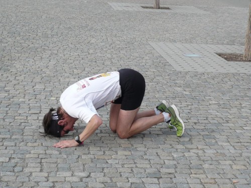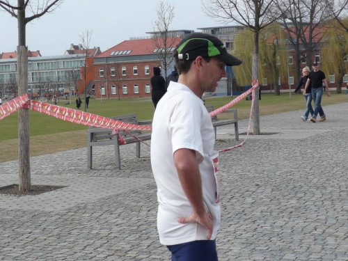 Neben mir stehen einige Mitläufer. Dieter, rund 15 Meter hinter mir, küsst den Boden, dann liegt er darnieder. Nach fünf Minuten kommen zwei Streckenvermesser mit ihrem Messrad. 226,10 Meter lese ich. Das sind dann 46 Runden oder 61,025 Kilometer in sechs Stunden.