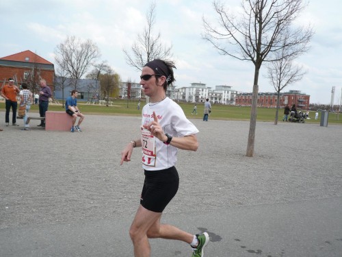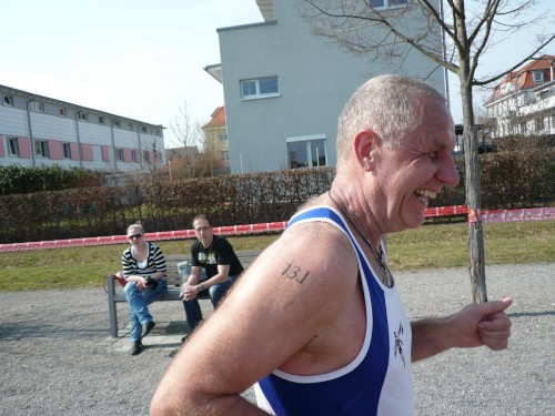 Zur Halbzeit bin ich gut im Rennen. Mein Ziel, 60 Kilometer zu erreichen, ist realisierbar. Im Feld mischt auch ein Reporterkollege mit, der Olaf, heute ohne Fotogerät unterwegs. Dann sehe ich zum ersten Mal unseren Südtiroler Freund Hartmann, der jetzt fast wieder jedes Wochenende unterwegs ist. Sein Besuch in Fürth beseitigt einen weiteren weißen Fleck in seiner Landkarte, denn er macht jedes Rennen nur einmal. Stark drauf ist er, denn ich habe für eine Überrundung drei Stunden gebraucht.