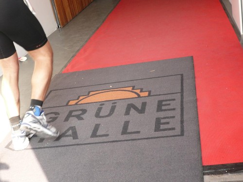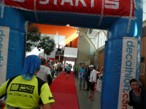 Noch wenige Minuten. Beim Rennen durch die Halle sehe ich bei mir 60,8 Kilometer. Super, Ziel geschafft. Und dann nach weiteren guten 200 Metern hören wir ein lautes Signal, die sechs Stunden sind um.