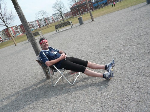 Ich zähle nun jede Runde und rechne meinen Restweg zu den magischen 60 Kilometer. Es könnte reichen. Nur, eine Schwächephase kann ich mir nicht leisten. Hartmann, nun auf einem Klappsitz in der Sonne hockend, macht einen auf Piz Buin. Er beobachtet das Feld und ruft mir zu, die 50 reichen ihn.