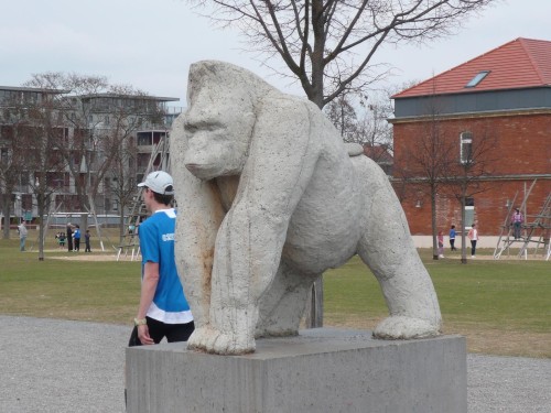 Dann sehe ich Pumuckl bei seinem Versorgungsgang. Es hat einen dreiundzwanziger Bolzen in der Hand, den man mit einem siebzehner Schlüssel aufmacht. Ein kleines Rätsel. Ja, mia san mia und hom a guats Bia. So geht die Flasche hin und her, bis zum Bodensee. Da ist die Flasche dann leer. Diese Einlage beschert mir die beste Rundenzeit, von hinten gesehen. Bisher waren es rund sieben Minuten, diese ist jetzt zweistellig. Schnell durch die Halle, bevor das jemand merkt.