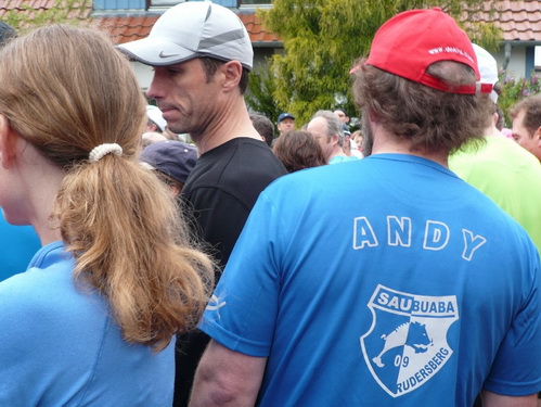 Für Punkt neun Uhr ist der Start vorgesehen. Zuvor bekommen die Teilnehmer noch die letzten Informationen. Insbesondere könnte es den Marathonis auf ihrem Rückweg passieren, dass sie im Stadtwald der Waldbahn Vorfahrt gewähren müssen. Dieter Schick als Chef verkündet stolz einen neuen Teilnehmerrekord. Knapp 900 Meldungen stehen in den Büchern. Ob die württembergische Volkslauf-Mannschaftswertung oder das günstige Wetter den Ausschlag dazu gibt, kann ich nicht beurteilen.
