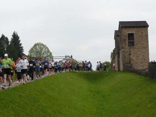 Pünktlich werden wir auf die Strecke gelassen. Fast ein wenig eng ist der Startraum für die Marathonis und Halben, aber auf der Strecke wird sich das schon noch geben, da bin ich mir sicher. Nach etwa 200 bis 300 Metern sind wir bereits auf dem Gelände des Ostkastells. Wir laufen durch das Tor, das die beiden Wachttürme bilden. Nach einen weiteren Wegstück durch die Anlage geht es wieder in den Ort, wo noch ein paar Treppen warten.