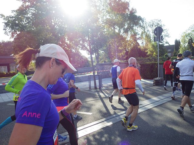Im großen Starterfeld verlieren sich die gut 70 Marathonis etwas. Wir laufen durch die Fußgängerzone und begeben uns auf den 21,1 km langen Rundkurs, den wir 2-mal durchlaufen müssen. Schon nach 2km verlassen wir das städtische Gebiet, biegen links ab und folgen der Rur. Duisburger aufgepasst, das ist die Rur ohne „h“. Der Name des Flusses wird zur Unterscheidung von der zum Rhein fließenden Ruhr seit etwa 1900 ohne „h“ geschrieben; zur Unterscheidung spricht man auch von der Eifel-Rur. Beim Monschau Ultra im August hatte ich schon ein anderes Stück diese schönen Flüsschens erleben können. Die Rur ist übrigens 164 km lang und fließt in Belgien in die Maas.