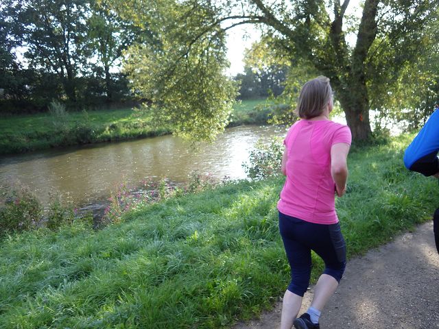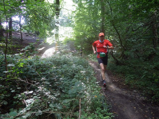 Wir umgehen diese geschickt und folgen den noch oberirdisch liegenden Kabelsträngen. Dann erreichen wir den Bahnhof in Baal, und unterqueren diesen. 300 Meter weiter folgt dann die nächste Verpflegung. Bisher war noch alles recht flach. Hat da nicht jemand etwas von einer profilierten Streckenführung erzählt? Nichts ist bisher davon zu spüren. Dann aber, direkt nach der Verpflegung, geht es in der Nähe von Doveren in das Hügelland. Über Felder, Wiesen und Wald laufen wir auf trailigen Pfaden immer wieder bergauf und bergab. Ok, vergleichbar mit dem P-Weg von vor 14 Tagen ist das nicht, aber immerhin heftig genug, dass sich meine dort geschundenen Muskeln daran erinnern und rebellieren.