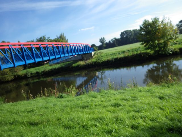 Kurz danach kommen wir zu einer Stahlbrücke über die Rur, wo die 10 km Läufer und Walker abbiegen, um schnell Richtung Ziel zu laufen. Wir dürfen der Rur 4 km weiter folgen. Bevor die Strecke dann auf die B57 nach Körrenzig stößt, biegen wir nach links auf eine kleine, einspurige Rurbrücke ab und kommen zum 2ten Verpflegungsstand. Direkt dahinter laufen wir über einen aufgewühlten Feldweg weiter. Hier waren aber nicht die sonst üblichen Wildschweine die Täter, sonders das örtliche E-Werk, das neue Kabel verlegt und mehrere Bagger im Einsatz hat.