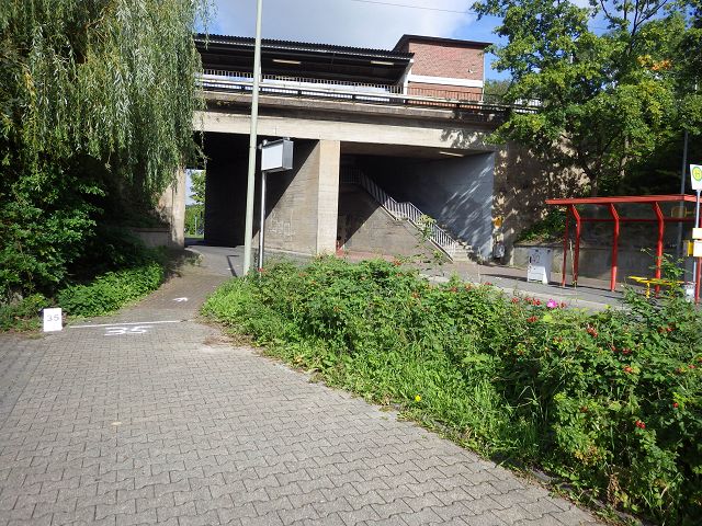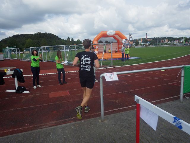 Trotzdem, dieser Teil ist wirklich schön und eine ideale Ergänzung zur schönen Rur. Dann verlassen wir den Wald. Links von uns liegt der Friedhof von Hückelhoven und es sind nur noch 2 km bis zum Stadion. Wir laufen nun in der anderen Hälfte der Stadt und nähern uns dem Stadion dann wieder durch die Fußgängerzone. Dann ein kurzer, aber sehr steiler Anstieg zum Stadion und eine halbe Runde auf der Bahn bis zum offiziellen Wendepunkt. Es muss ja ganz genau sein, denn schließlich finden heute auch die Marathon Kreismeisterschaften statt.