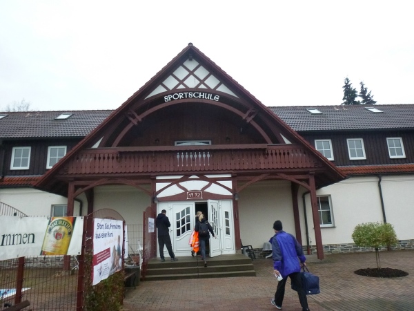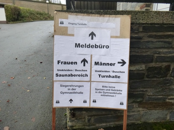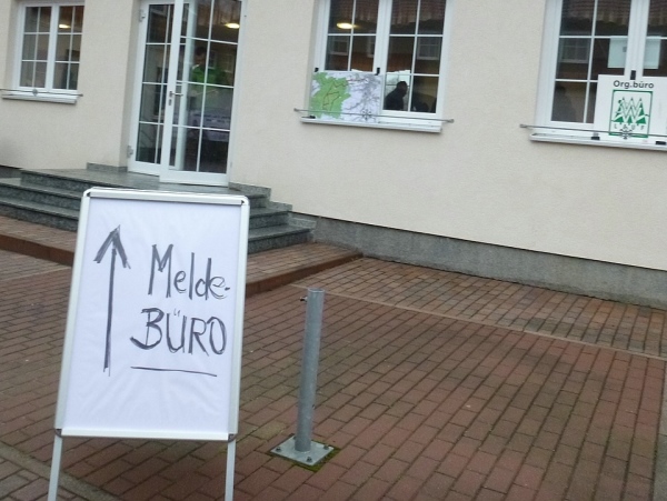 Also auf nach Werdau ins Sachsenland. Regen und starker Wind begleiten mich am frühen Morgen dorthin. Die Wettervorhersage sagt uns weiterhin viel Wasser von oben voraus. Start und Ziel ist die Sportschule. Im Speisesaal gibt es schnell und routiniert die Startunterlagen. Hier ist auch die Möglichkeit der Nachmeldung. Seine Sporttasche kann man im Wettkampfbüro zur Aufbewahrung geben.