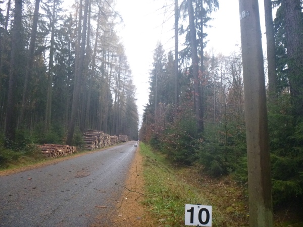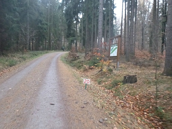 Nun geht es abwärts am Wald entlang zur Waldsiedlung und weiter zur Cottaeiche, wo wir versorgt werden. In Leubnitz, einem Stadtteil von Werdau, biegen wir ab und tauchen kurz danach in den Wald ein. Große Hinweisschilder weisen uns den Weg. Ich bin mit einigen langsameren Läufern am Schwätzen und merke nicht, dass ich viel zu schnell angelaufen bin. 9,5km/h Durchschnitt zeigt mein Garmin an.