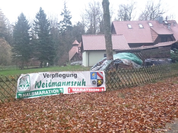 Bei Kilometer 10 liege ich noch locker im Limit. Wir kommen an das Waldgasthaus Waidmannsruh und werden hier bestens versorgt. Weiter geht es in die 10km Runde, die es jetzt gilt, zügig zu durchlaufen. Es geht sehr wellig durch den Forst. Beim Kilometer 21 kommen wir wieder ans Gasthaus. Meine Zwischenzeit 2:28. Passt gerade noch. Jetzt gibt es auch den begehrten Schleim. Weiter, in die 2. Runde.