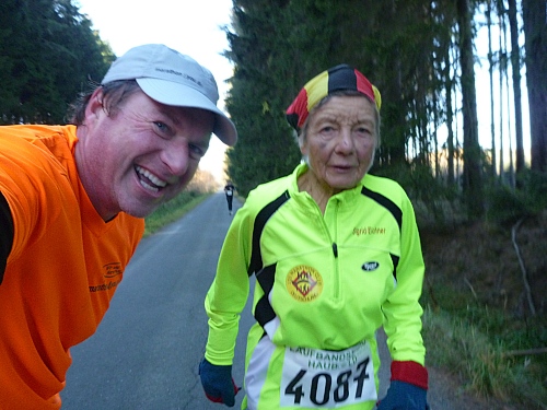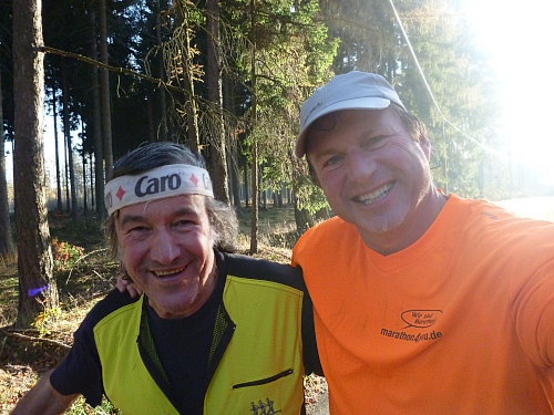 Ganz schlimm wird es, als ich Siegrid überhole. Ich glaube, ab da habe ich ihren schmerzhaften Laufstil übernommen. Ja, die ewig langen „Steigungen“ muss man laufen. An der Weidmannsruhe gibt es wieder den herrlichen, warmen Haferschleim. Den habe ich immer bei meinen Läufen im Osten genossen. Da breche ich auch gerne mit meinem Image. Nun gut, manchmal mische ich ein bißchen Bier dazu, aber das gibt es hier heute nicht. Zur Erklärung: Haferflocken in heisses Wasser mit Kondensmilch und Heidelbeercreme - ist wohltuend für den Magen und gibt Energie. Laufen macht jung, und mit diesem Zeug bin ich groß geworden, sehr groß.