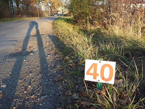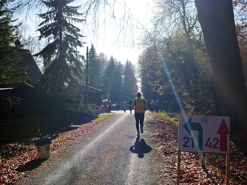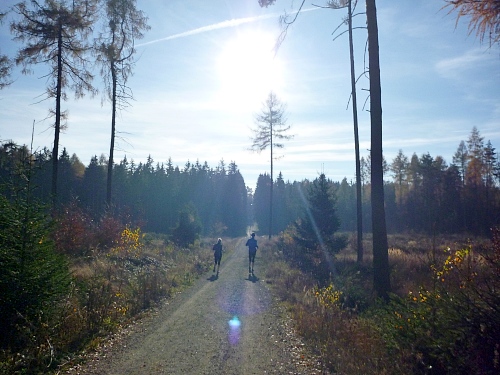 Fürstenstuhl (km 14,8 ), 3 Lärchen (km 16,4) kennzeichnen einige Punkte der „Bratfläche“. Es sind sehr langgezogene Steigungen und sehr langgezogene abfallende Strecken, eine Freude hier zu laufen. Die tiefstehende Sonne ist der Hit, in den Kuhlen bedeckt dicker Frost die Gräser, die Luft ist herrlich und die Laune einmalig. Mann, bin ich froh hier zu sein!