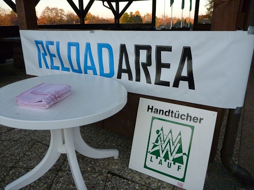 Die Strecke sieht aus wie eine stark zerknitterte Pfanne, die „Bratfläche“ muss zweimal durchlaufen werden, den „Pfannenstil“ haben wir jetzt hinter uns, als wir zur Weidmannsruhe (km 11.3) kommen. Hauptverpflegungspunkt mit dem allerbesten Haferschleim, den ich je hatte, dazu Wurstbrote, Cola, warmen Tee und endlich mal Wasser mit Kohlensäure.