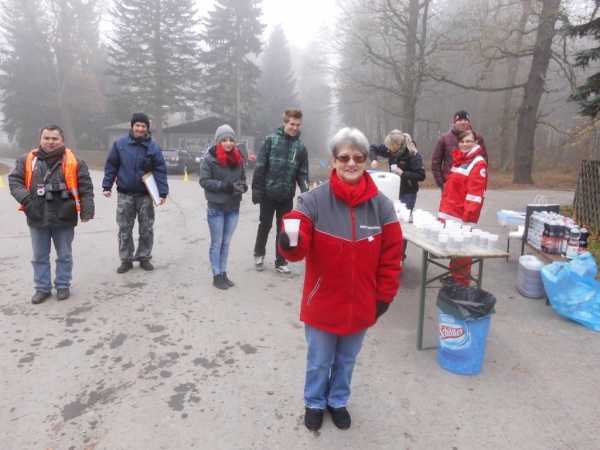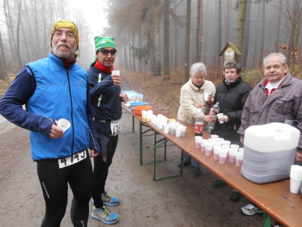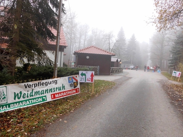 Bei Kilometer 11, an der Waldgaststätte „Weidmannsruh“, beginnt ein Rundkurs, der zweimal zu durchlaufen ist. Dort befindet sich eine Verpflegungsstelle. Ich habe schon den Tee in der Hand, da bietet man mir Schleim an. Den nehme ich auch. Und das ist richtig - denn der schmeckt.