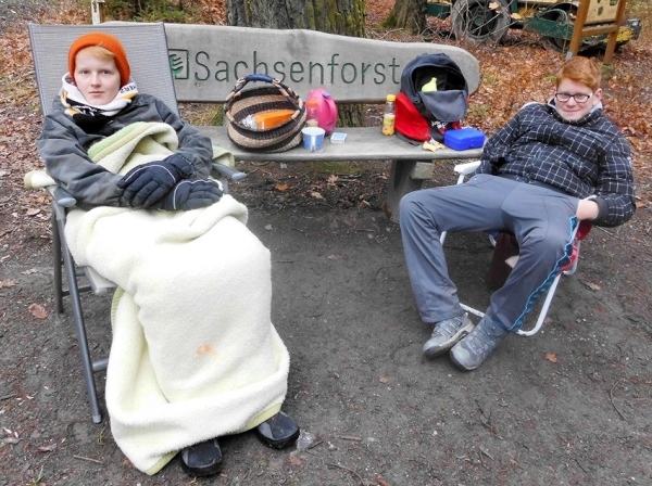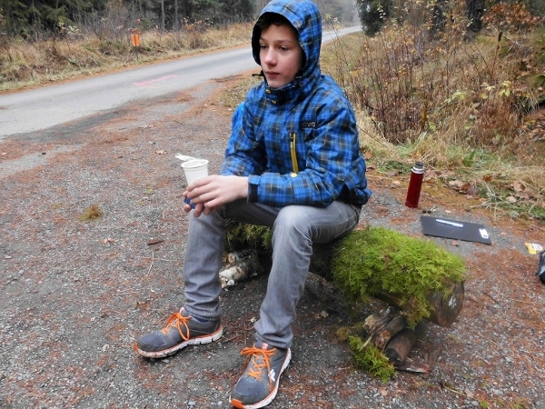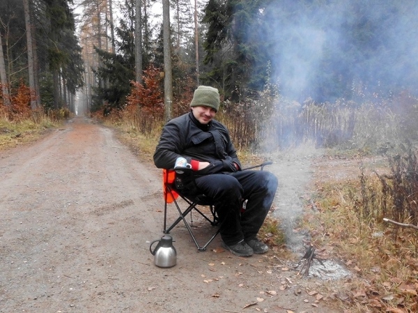 Da habe ich nun eine gute Tat begangen, aber trotzdem fällt mir die zweite Runde nicht leichter. Es läuft nicht so, wie ich mir das wünschen würde. Schlimmer als ich sind wohl nur die Helfer an der Strecke dran. Es regnet zwar nicht, aber es ist kalt. Einer der Streckenposten hat sich ein kleines Feuer angezündet. Die Nächsten haben aus einem Baumstamm und Moos eine Bank gebaut, andere sich in Decken gehüllt. Alles schöne Motive, da muss ich fotografieren, wohl wissend dass mir nun nicht nur Hans-Joachim, sondern auch die Zeit davonläuft. In 3.45 Stunden muss ich die Zeitkontrolle bei Kilometer 31 erreichen. Also wieder Kopf nach unten.