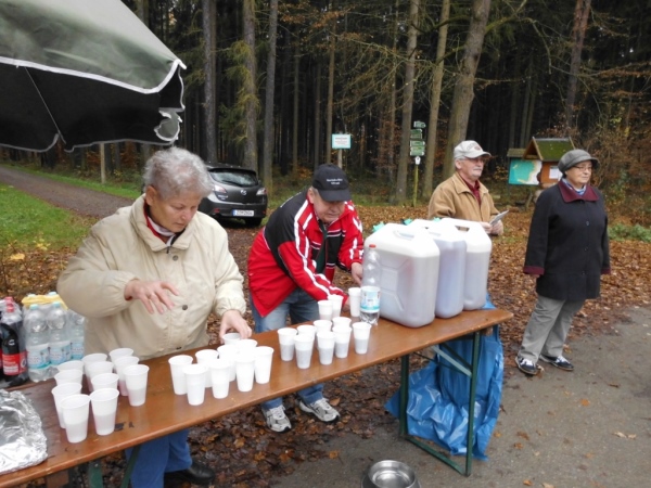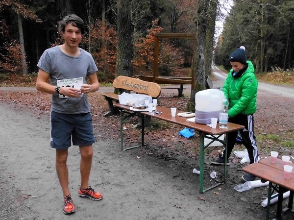 Der wohl wichtigste Punkt der Strecke ist die Gaststätte Weidmannsruh, oder besser gesagt, die Verpflegungsstelle davor. Ich erreiche sie erstmals bei Kilometer 10. Man kennt sich, ich bin das vierte Mal in Werdau dabei und die Helfer sind auch Wiederholungstäter.