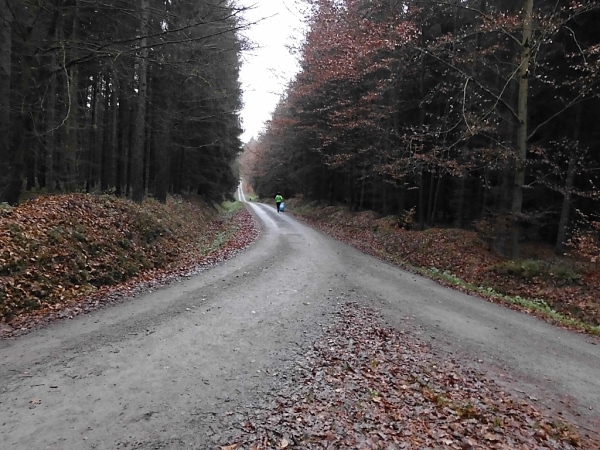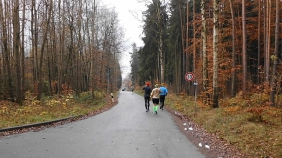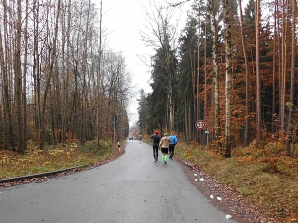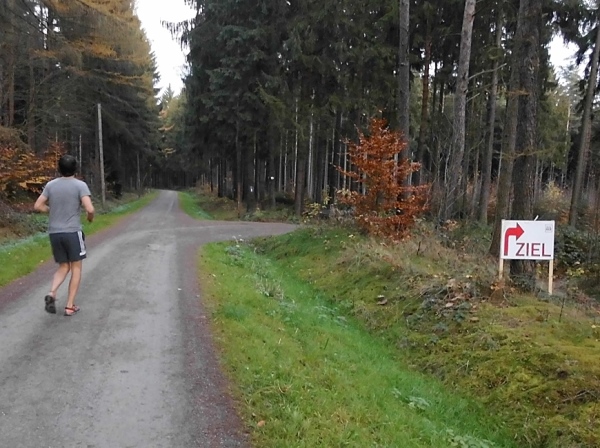 Ich schnappe mir meinen Teebecher und mache mich auf die hier beginnende 10-Kilometer-Runde, die zweimal zu laufen ist. Die Marathon-Paarläufer haben uns verlassen, ich habe Platz auf den gut ausgebauten Waldwegen.