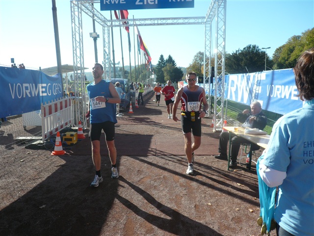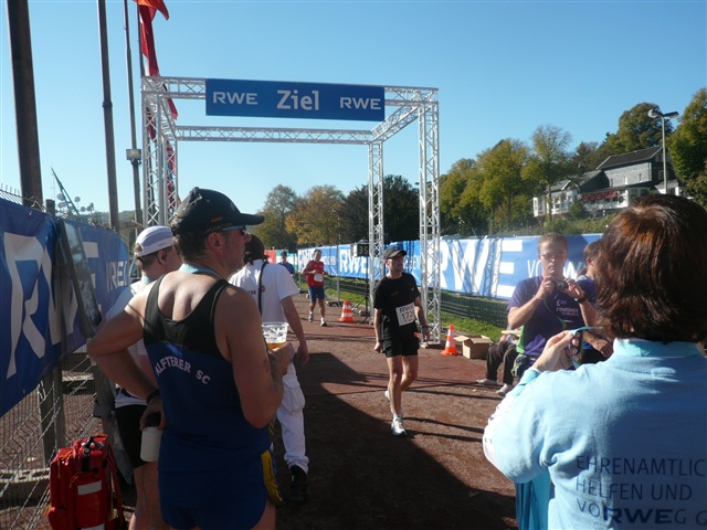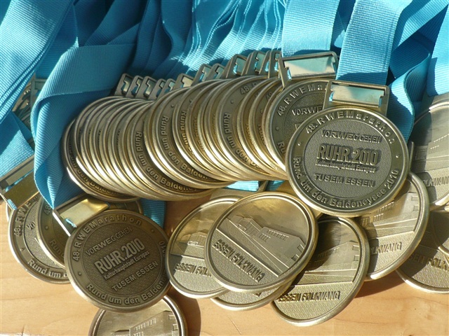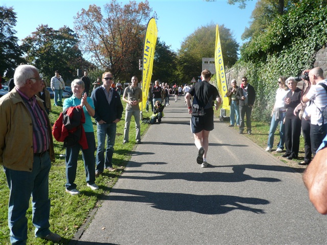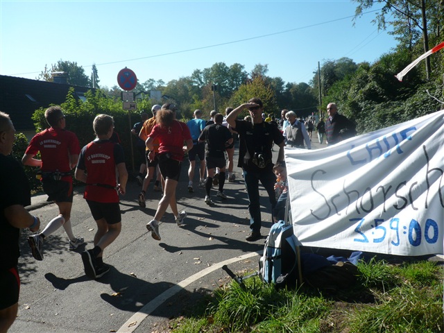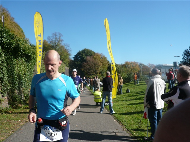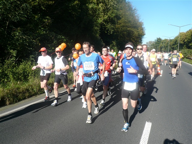 Wieder bin ich gerade im Pulk der 4 Stunden-Läufer unterwegs, was gar nicht nach meinem Geschmack ist, denn da gibt’s immer so ein Gedrängel an den Verpflegungsstellen. Ich setze mich daher etwas ab, um einen ausreichenden Vorsprung zu gewinnen. Ebenfalls nicht ganz nach dem Geschmack ist auch die Zahl der Teilnehmer für den Veranstalter. 1.441 Einzelstarter hatten sich vorangemeldet, im Vorjahr waren es 1.612 und 3.000 hätte man gerne. Nicht schlecht, aber weniger als erhofft, so Stefan Losch, 1. Vorsitzender der Tusem-Leichtathletik-Abteilung. Daß es weniger Läufer als im Vorjahr sind, liegt wohl auch daran, daß der 2009er Lauf gleichzeitig als Westdeutsche Meisterschaft ausgetragen wurde. „Wir hatten uns aber erhofft, dass durch das Kulturhauptstadt-Jahr mehr Menschen angelockt würden“, sagt Losch. Zwar sind in diesem Jahr mehr ausländische Teilnehmer am Start, im Ziel waren allerdings lediglich 1.250 (davon 203 Frauen) und damit erheblich weniger als im letzten Jahr. Und das trotz etlicher Nachmeldungen, wie ich beobachten konnte. Na, wenigstens mit der Zahl der Staffeln (176) hatte man die Kapazitätsgrenze von 200 im Visier.