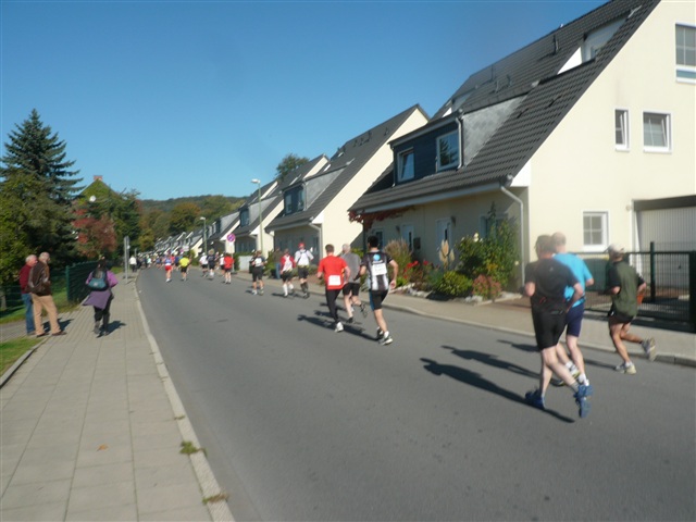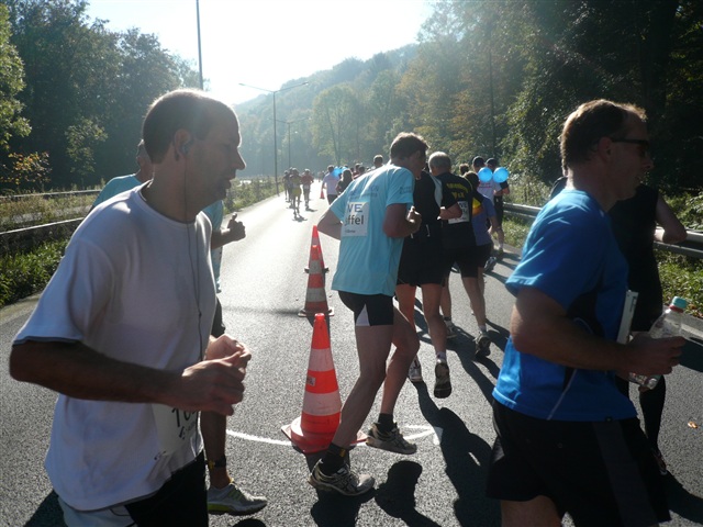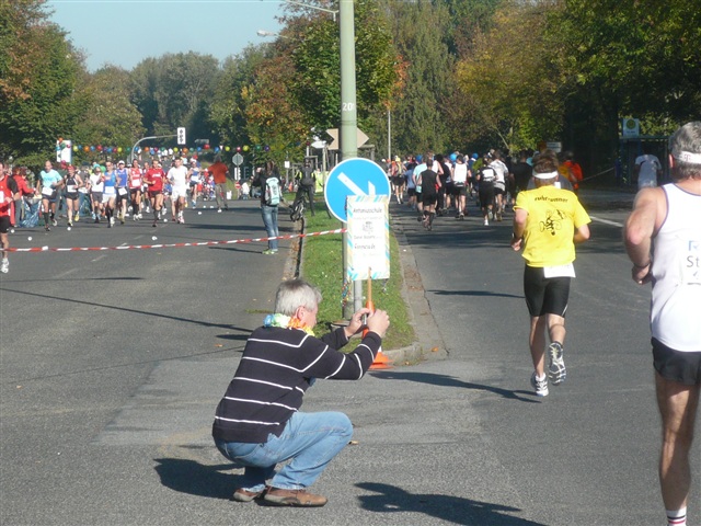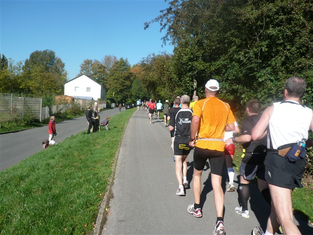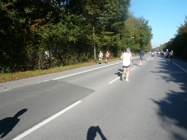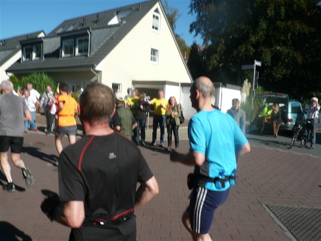 Diese Wendepunktstrecke bietet wie immer eine gute Möglichkeit, die Konkurrenz bzw. Mitläufer zu beäugen. Zwei „Schwatte“, wie man hier sagt, trommeln sich einen ab und strahlen ob meines Beifalls über alle vier Backen. Sowohl auf dem Hin-, als auch auf dem Rückweg. Richtigerweise erfolgt am Wendepunkt bei km 15 eine Zeitnahme (Kontrolle) und verhindert mögliche böse Taten. Kurz nach der Wende werde ich angerufen und freue mich, Achim zu sehen. Er ist Co-Autor („Sesam“) und will nach langer, krankheitsbedingter Marathonabstinenz heute seine marathonische Wiederauferstehung feiern.