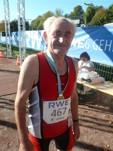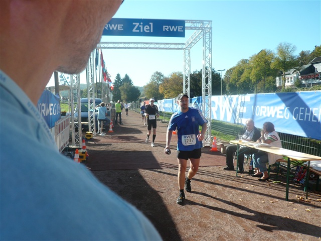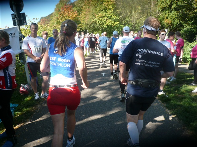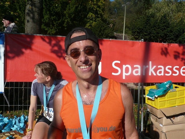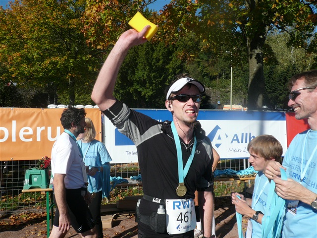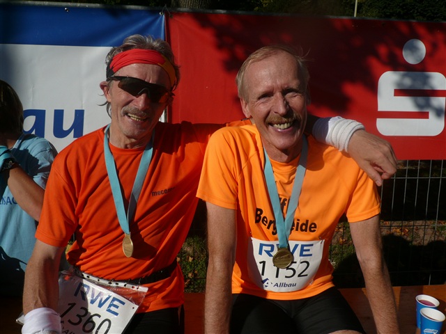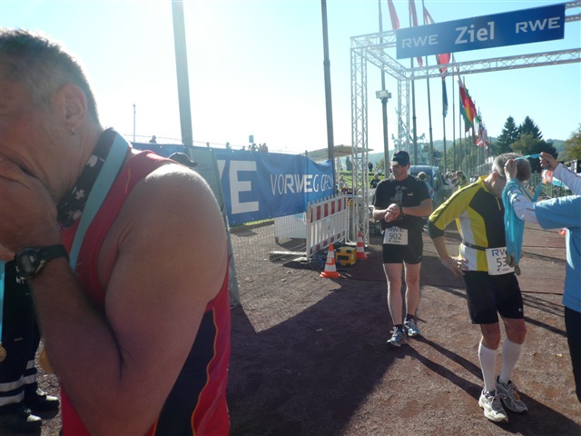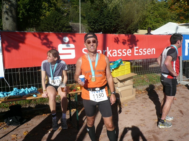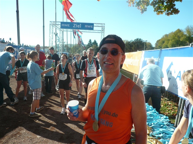 Vor der Tribüne an der Regattastrecke kommt ein Cafe, aus dem mich der Dirk von der LG Donatus Erftstadt (3:14, Respekt, Dirk!) anruft: „Wolfgang, willsten Bier?“ Das sind echte Freunde, das muntert auf. Genau so, wie die lieben Angehörigen des VfL Bergheide um Werner Kerkenbusch, die mich mittlerweile ins Herz geschlossen haben. Danke, liebe Freunde für Eure Unterstützung!